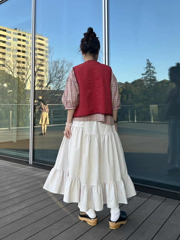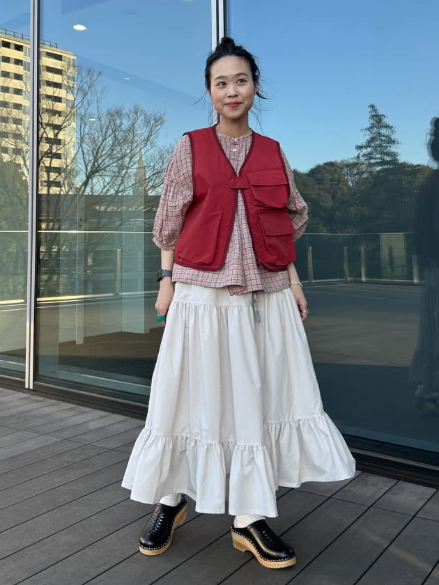 甘めなシルエットなので、スカートの雰囲気に合わせてチェックのブラウスを。さらっとしすぎないように、ベストをアクセントに加えたスタイリングです!