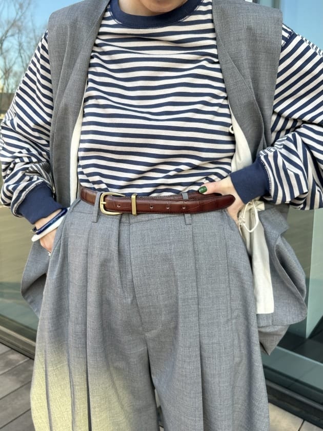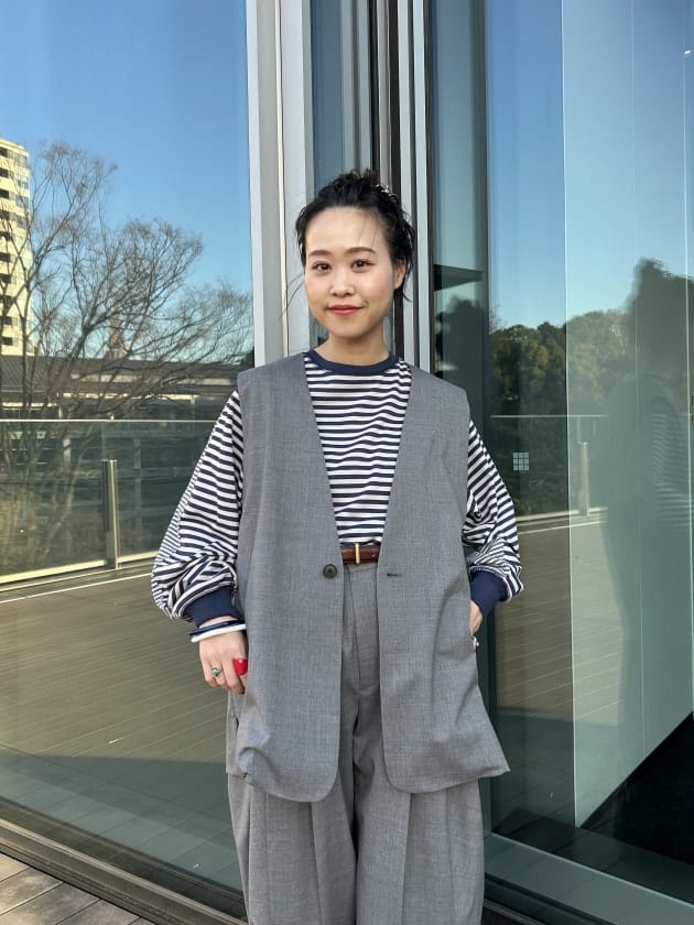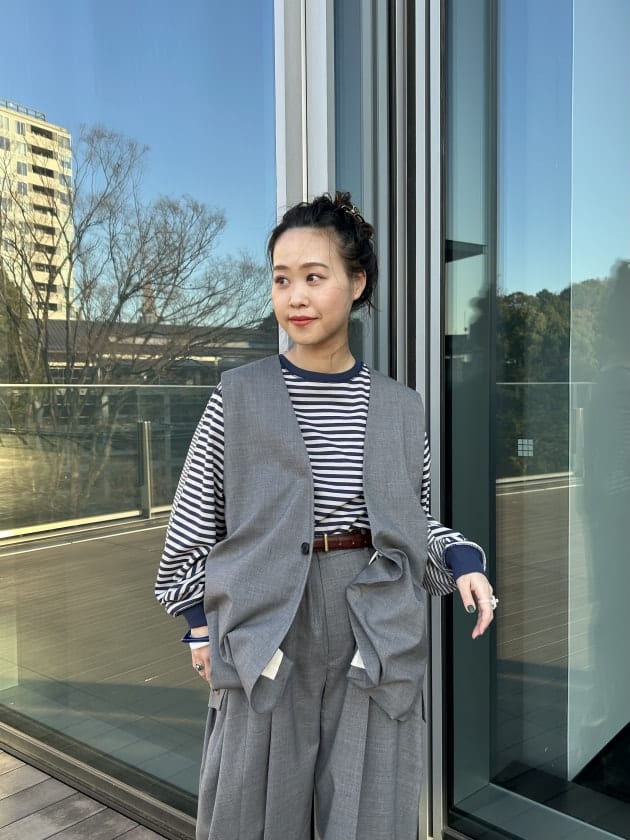 ガーリーなブラウスとメンズライクなベストのバランスもとっても素敵です。