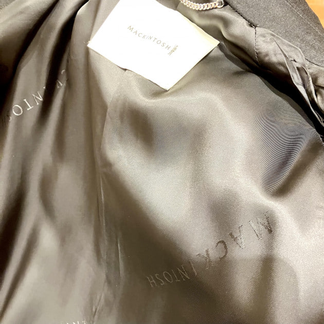 裏地は<MACKINTOSH>のロゴが入ったオリジナルのキュプラの裏地が付いています。とても高級感が感じられます。いかがですかライトメルトントレンチコートとてもカッコいいですよ。今の季節に着ていただいても決して大げさには見えないと思います。ビジネスシーンにはダークネイビーのご用意もございます。