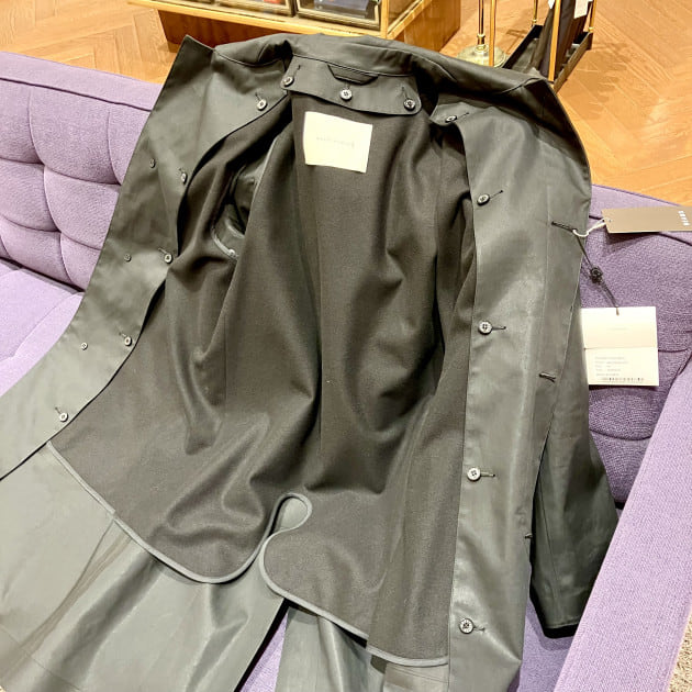このコートに使われている素材は<MACKINTOSH>のヘリテージであるゴム引きコートを現代的に再解釈した「MACKINTOSH RAINTECH / マッキントッシュ レインテック」という透湿防止の機能に優れたもので、すべての縫い目の裏側に止水テープを施すことで高い防水性を持っています。<MACKINTOSH>の新たなシグネチャーラインです。