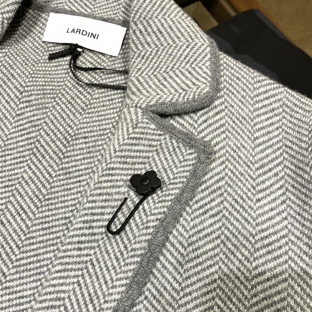 こちらは皆様ご存知の<LARDINI / ラルディーニ>のウール100%のニット素材ジャケットです。さすが<LARDINI>ニット素材でもきれいな立体感のあるシルエットに仕上がっています。ニット素材なのでカーディガンの様に軽快に羽織っていただくと良いのではないでしょうか。