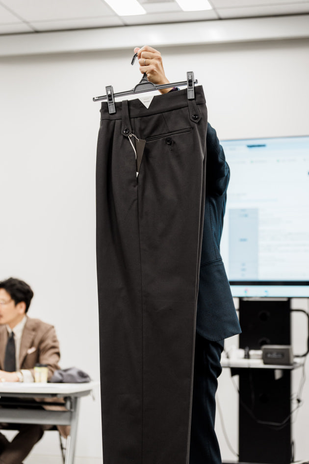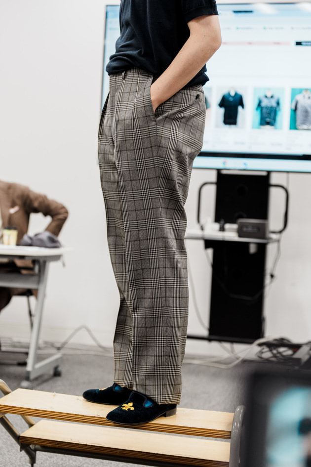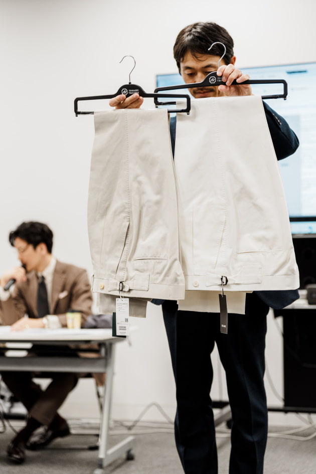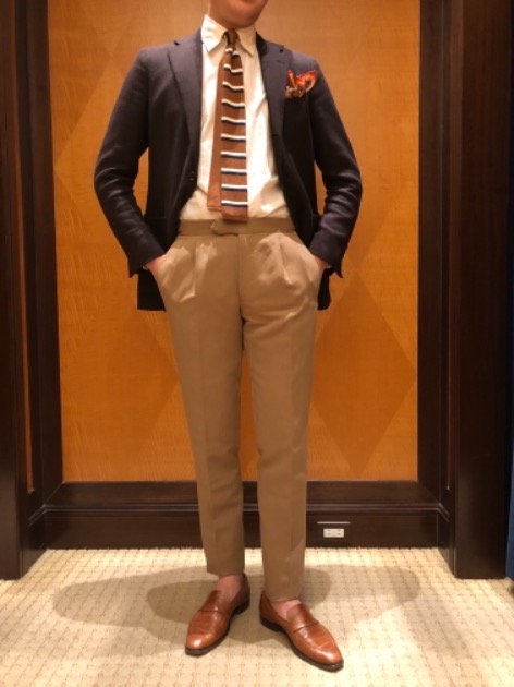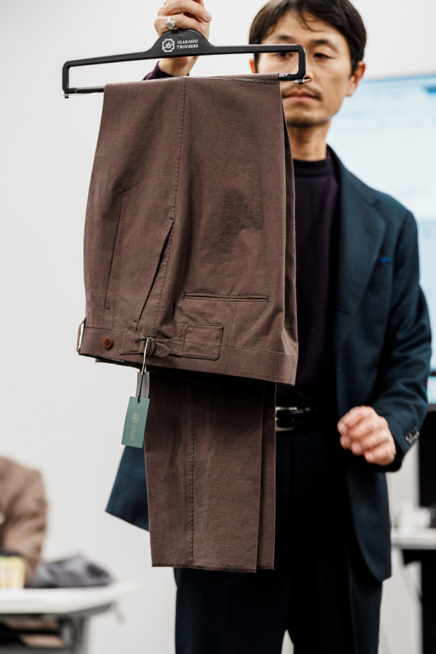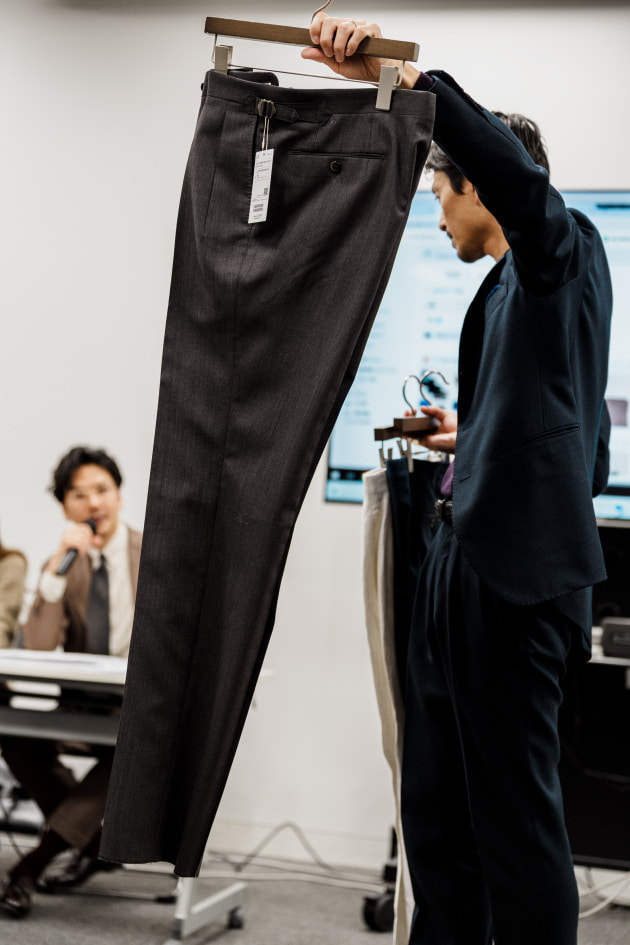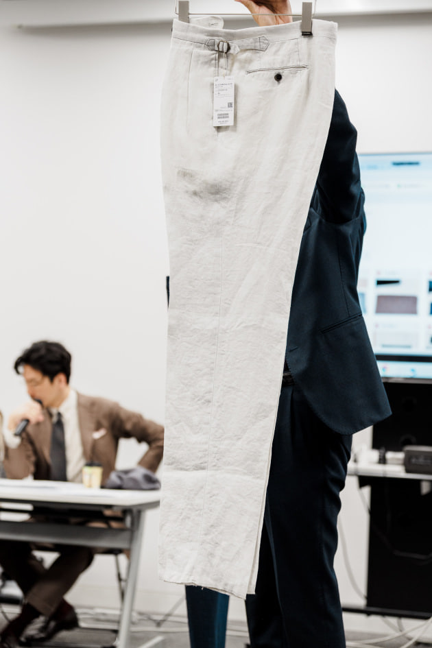 そしてサンプルはありませんでしたが、個人的に気になっているのが4プライウールで織られたトロピカル組織のモデル。しっかりとしたハリとコシがあり、クリースラインも美しく出そうな素材感で、濃いグレーのパンツをあまり持っていないこともあり、この一本は予約しようかと考えています。