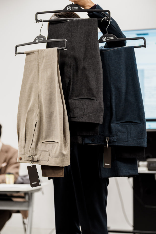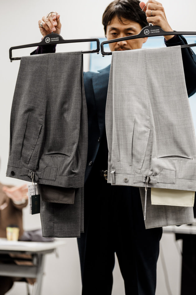 <IGARASHI TROUSERS(イガラシ トラウザーズ)>からは、ブランドの履き心地の良さをより多くの方に体験していただきたいという思いから、尾州産のライトグレーとミディアムグレーのトロピカルウールを用いた別注モデルが登場します。