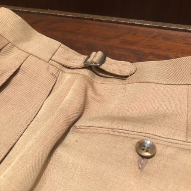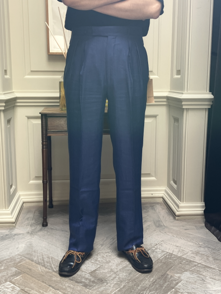 <Anderson&Sheppard>の店頭で展開している定番パンツをベースにした別注モデル。元々ベルトループ仕様のところを、今回は2インプリーツのサイドアジャスター仕様へ変更。さらにビスポークラインで使われているような長めのアジャスターを特別に採用しています。