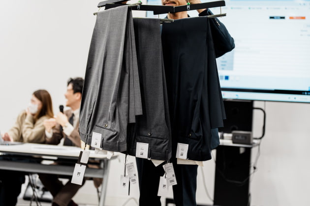 4プライウールフレスコによるGREYの2素材にて展開予定。4プライによって生まれるハリとコシ、そしてどこかクラシックな雰囲気が特徴で、美しいドレープ感と清涼感のあるタッチが両立されています。通年で着用しやすい汎用性の高さも魅力です。