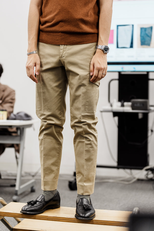 インラインのモデルはやや細めの設定だったため、別注では裾幅を1センチ広げ、サイズ48で約19センチに調整しています。