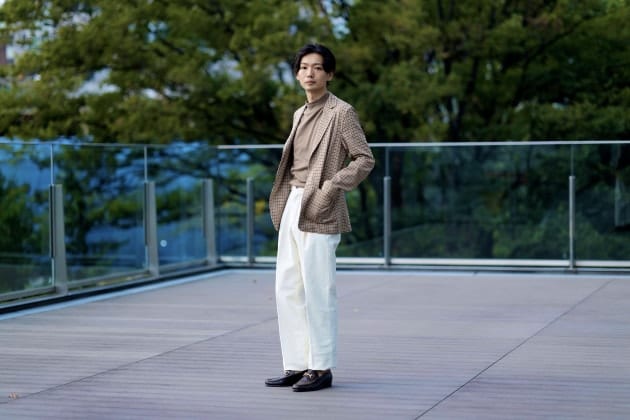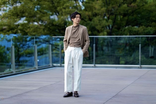 2アウトプリーツのストレートシルエットによるワイドパンツには、ヴィンテージライクな表情を持つウールフレスコを使用したD.BROWNと、