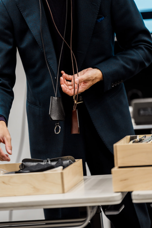 別注でオールレザーポーチも展開。インラインモデルをベースに、ストラップと両端のパーツを排することで、よりミニマルで使いやすいデザインに仕上げています。価格は4万円台と、上質なフランスレザーを使ったアイテムとして魅力的なプライスです。