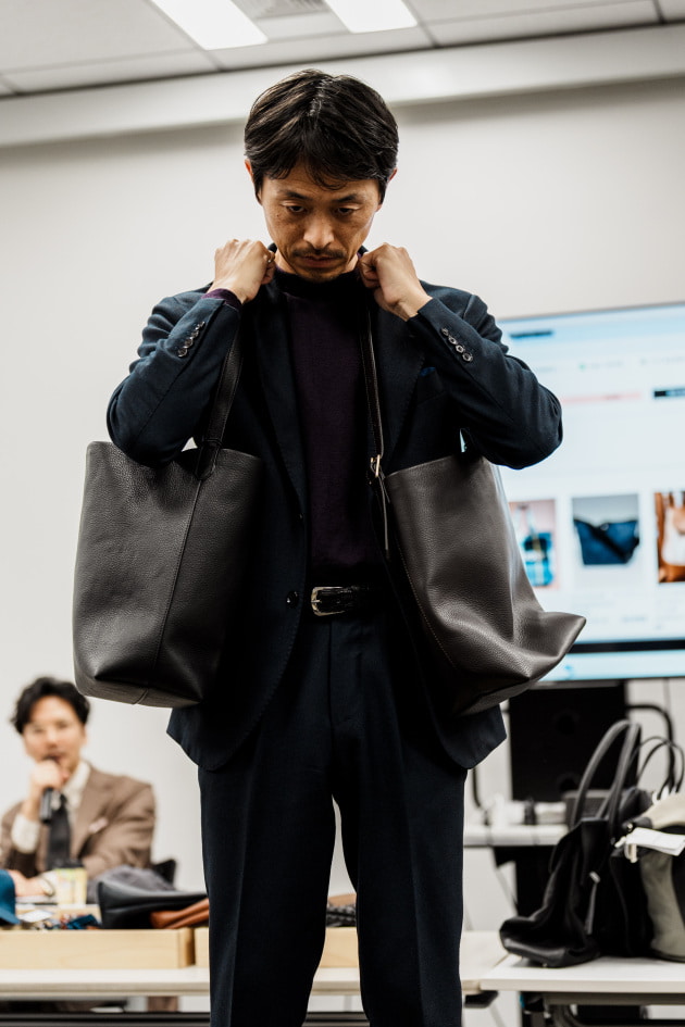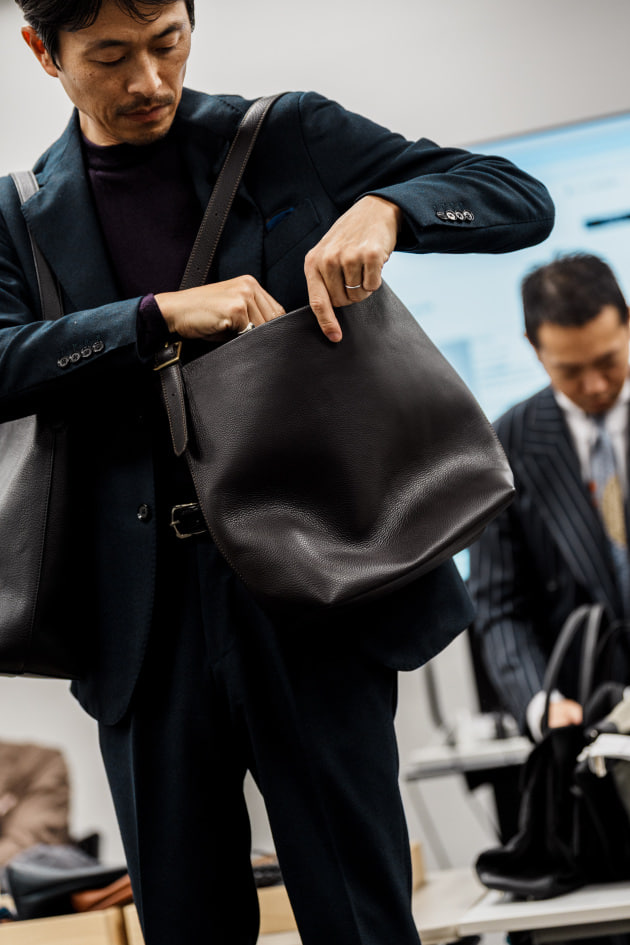 レザーはナチュラルなシボを活かした素上げに近い仕上げで、顔料を使わないことで非常に自然な表情と柔らかさを実現しています。さらに、革を0.8ミリまで薄く漉き、縫い目を極力減らすことで軽量かつしなやかなつくりに。ブランド史上もっとも軽さと繊細さを追求したバッグです。
