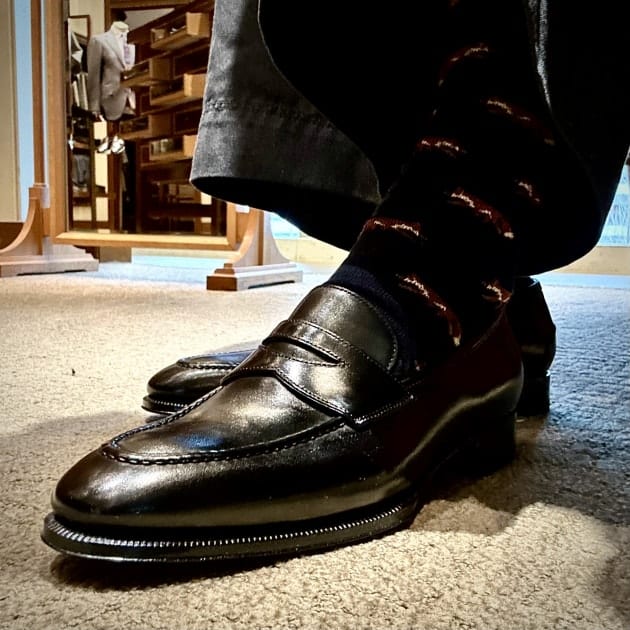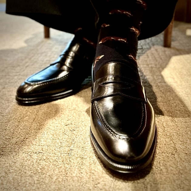 かなり馴染みの良いシューズで非常にエレガントな印象。ワイドパンツとの相性もよく、私もタッセルのモデルを愛用しています。D.BROWNもチラ見えしてますが、今回はBLACKのみオーダーしています。