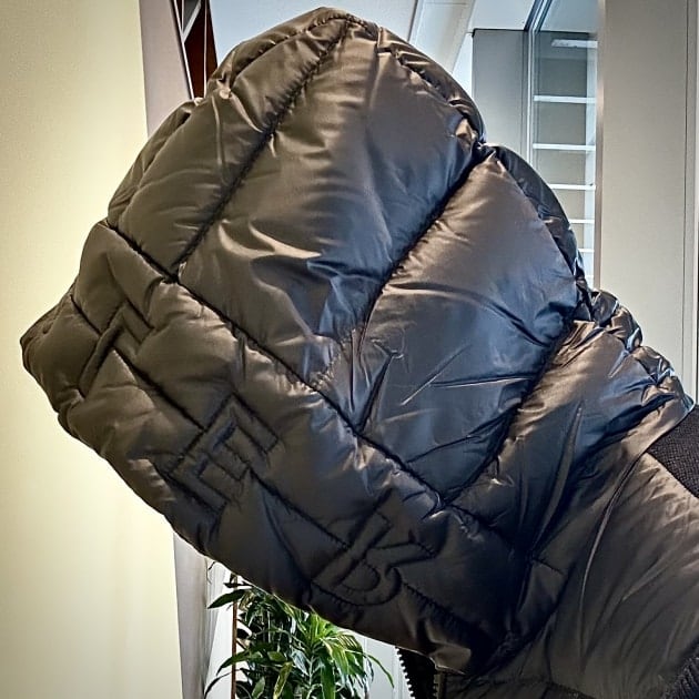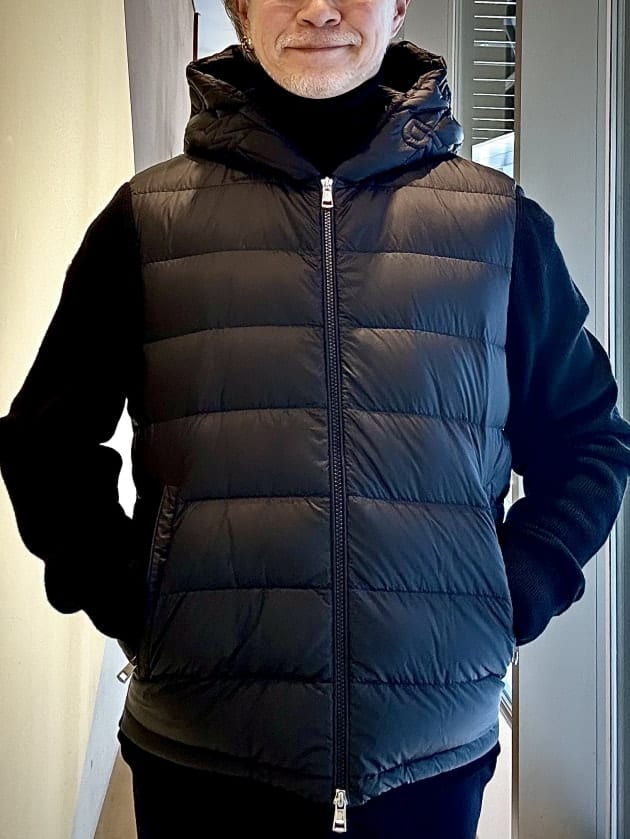 あまり着膨れして見えないシルエットですね。モダンな感じがします。中綿(ダウン90%フェザー10%)はしっかり入ってますので、よほど寒冷地でなければ保温性は十分かと思いますが。