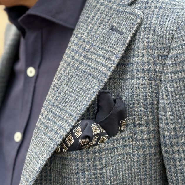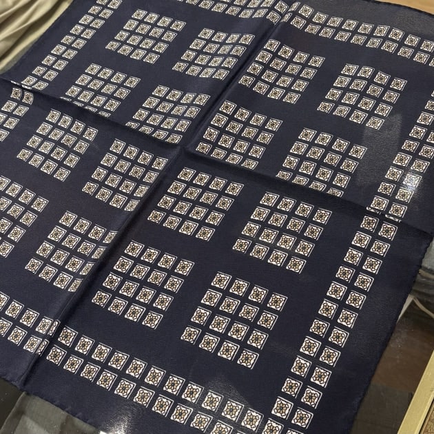 2枚目の画像の胸に挿したポケットチーフはこちらです。<BEAMS F>オリジナルのイタリア製のものになります。このチーフを選んだ一番の理由はシャツのネイビーの色を拾ったという点です。そしてジャケットに使われている大きめのグレンチェックに対して細かい小紋柄にしてそれぞれの柄の大きさにメリハリを付けたというところにあります。