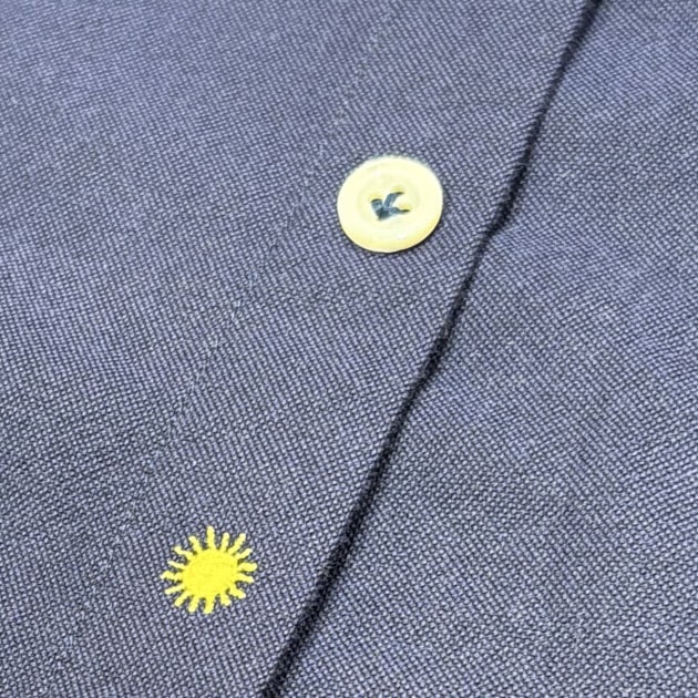 <GIANNETTO>のシャツのボタンは「鳥足掛け」という4つのボタン穴の1つから3つのボタン穴に糸を通すという縫製技術が使われています。これは、熟練した職人のこだわりを感じさせる手仕事ですが、単なるデザインだけでなく1つボタン穴に縫い糸が集中することでボタンにわずかな傾きが生まれ、それによってボタンに指を掛けやすく、片手でもスムーズに着脱できるようにという工夫です。また、<GIANNETTO>のイエローのアイコンですが、ビームスでは第3ボタンと第4ボタンの間に変更してもらっています。これはボタンを2つ開けて着られた時に、このアイコンが見えるのがお好きでないというお客様たちからのお声が多かったからです。