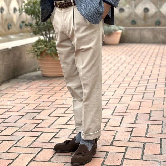 コーディネートしたパンツは<BEAMS F / ビームス エフ>オリジナルのリングヂャケットメイドのコットンパンツです。オフホワイトのパンツと迷ったのですが、イタリアの王道カラーコーディネートである「アズーロ・エ・マローネ (ブルーとブラウン)」を意識してベージュにしてみました。上半身がブルー系でパンツからシューズまでをブラウン系にすることでトラディショナルスタイルの中にイタリアン的なにおいを感じていただけるのではないでしょうか。こちらのパンツも再プライスダウンでお求めやすくなりました。