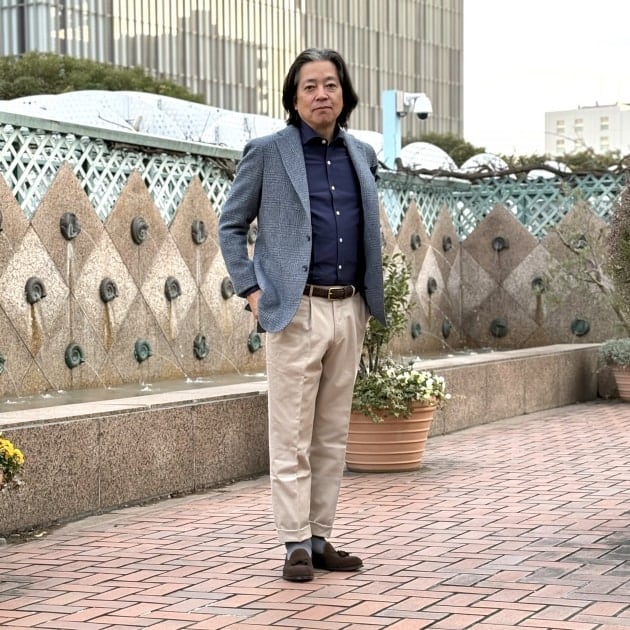 インナーのシャツは<GIANNETTO / ジャンネット>のオックスフォード素材のワイドカラーシャツです。濃い色目のシャツは体のラインをシャープに見せる視覚効果があります。特に私が着ている深みのあるネイビーは日本人の肌色によく合い、顔廻りに持ってくると肌の「黄み」を抑えてくれ、肌のトーンもパッと明るい印象になり着ている人に清潔感と明るさをもたらしてくれます。こちらのシャツもお買い得プライスとなっております。