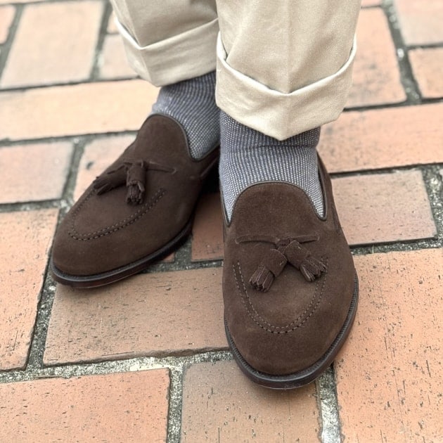 シューズは<CROCKETT&JONES / クロケット アンド ジョーンズ>の名作「CAVENDISH / キャベンディッシュ」を日本人向けにヒールカップを小さくして、かかとの抜けを改善させた「CAVENDISH3」です。踵がしっかりついてくることで、長時間歩いても疲れにくく、ローファーとは思えない快適な履き心地です。
