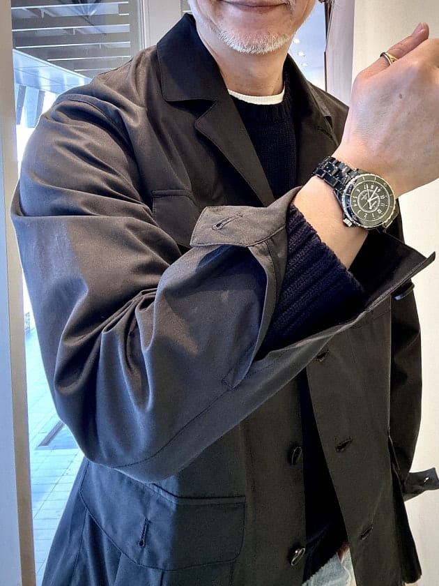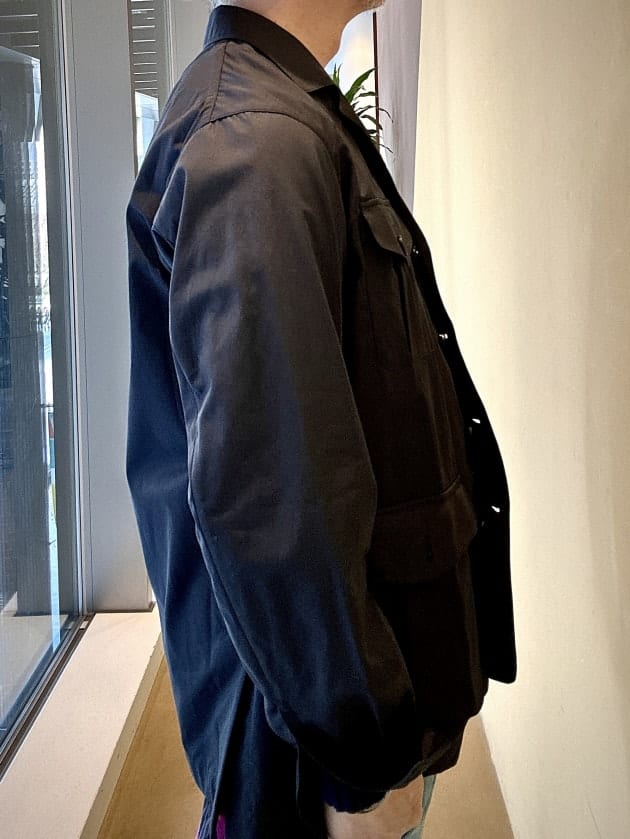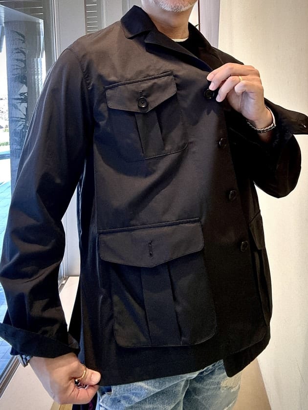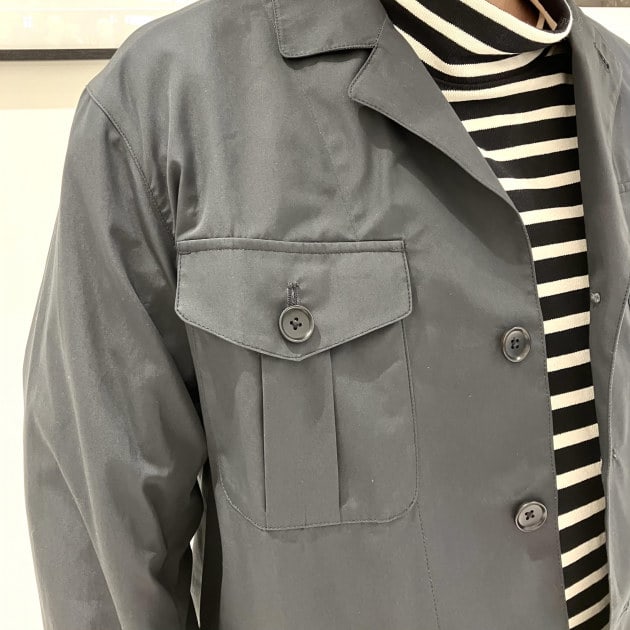 サファリジャケットらしいインバーテッドプリーツのポケットが男らしい印象がありますが、フラップが五角形(ベースボール型)にデザインされていることで本来のサファリジャケットの様な武骨な雰囲気が和らぎ、ドレスっぽいアウターに見えるようになったと思います。ちょっとした細かいディテールのデザインで印象はだいぶ違って見えると思います。