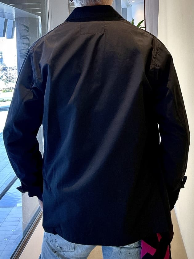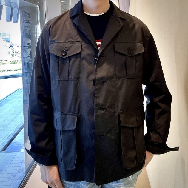 こちらです。<INVERTER / インバーター>のコットン100%のサファリジャケットです。一般的なミリタリージャケットは生地が固かったりして見た目がゴワっとしているものが多いですが、この<INVERTER>のサファリジャケットはとても柔らかい風合いの素材を使い、洗練されたパターンがドレスウエアのブルゾンといえる雰囲気を醸し出していると思います。