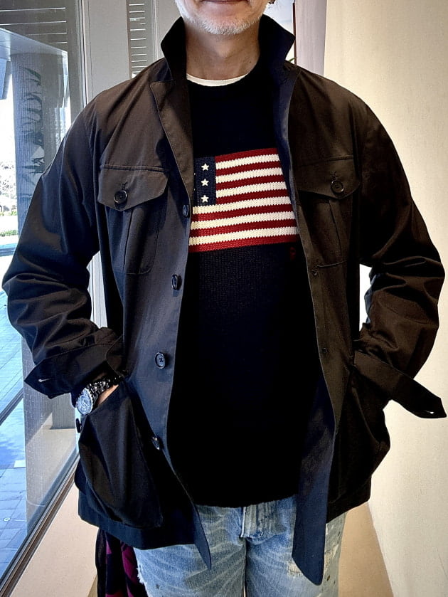 今回伊藤が作ったコーディネートはこちらです。インナーやボトムス、シューズすべてがマリンテイストなんですがサファリジャケットと合わせた「ミックスコーディネート」にしてみたとの事です。はじめは私も大丈夫かなと思いましたがカラーコーディネートで上手く調和が出来ているようです。さすが伊藤ですね。