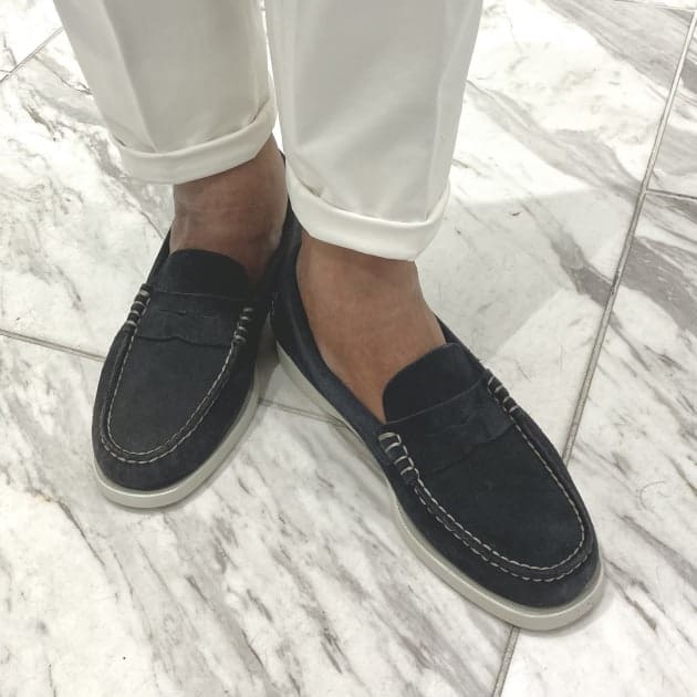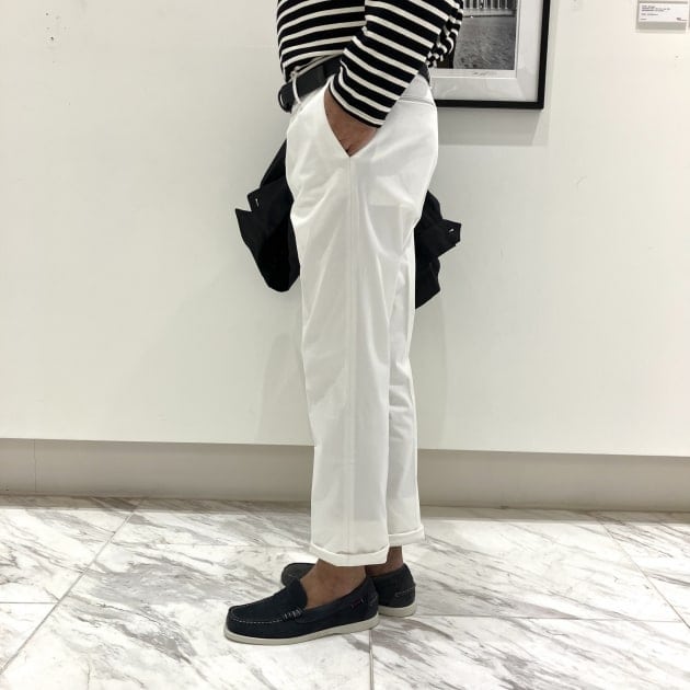 そしてシューズはわたくし共のボスである中村のレコメンドアイテム<SEBAGO / セバゴ>のデッキシューズです。アッパーがローファーデザインなので、使いやすいシューズだと思います。<SEBAGO>は1900年代の中ごろにアメリカで生まれたハンドメイドにこだわったシューメーカーです。
