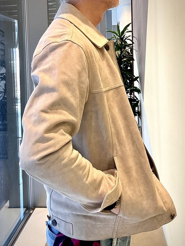 ちなみにコルビジェジャケットといえばダブルのものが多いですが、こちらは前合わせが深いシングルにしております。