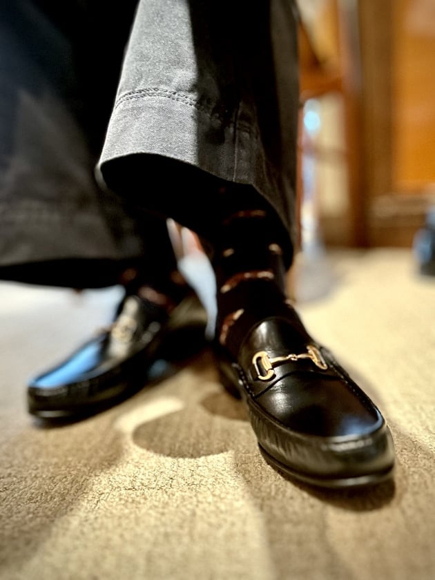 前述の通り馴染みが早いのはもちろん、ドレススタイルから意外と綺麗めカジュアルスタイルにまで合わせやすいのがこのビットローファーで、オンオフ問わず履いて早6年。