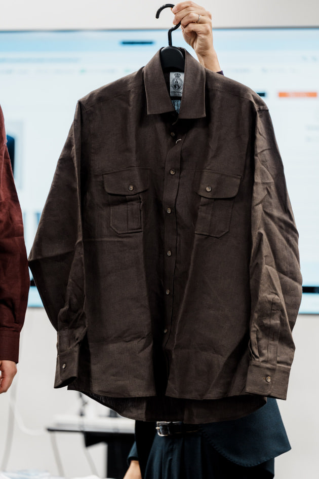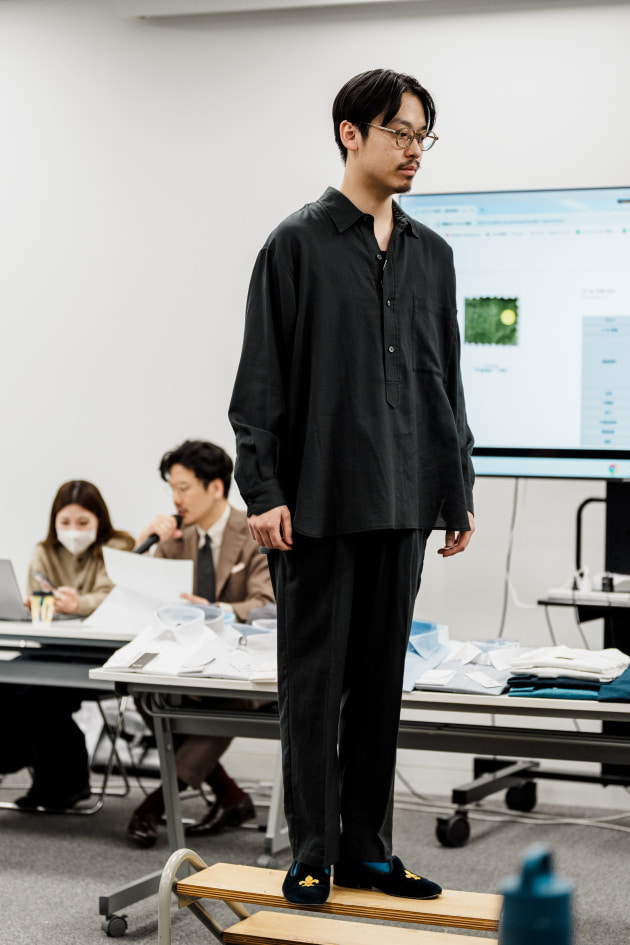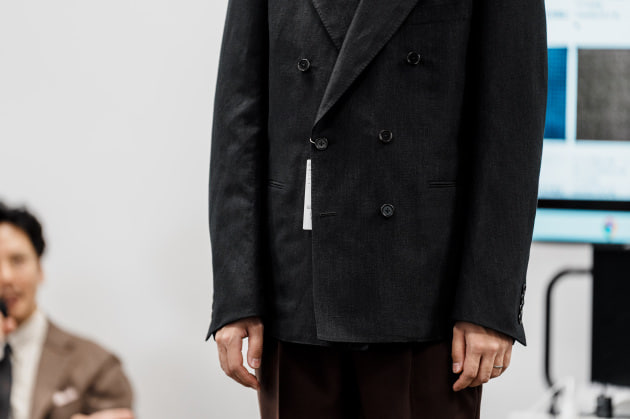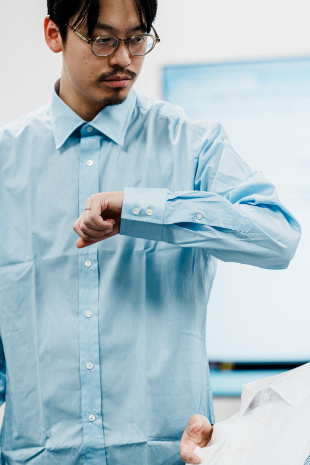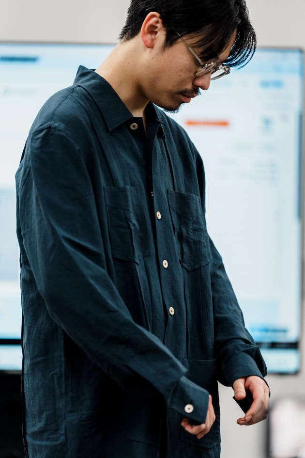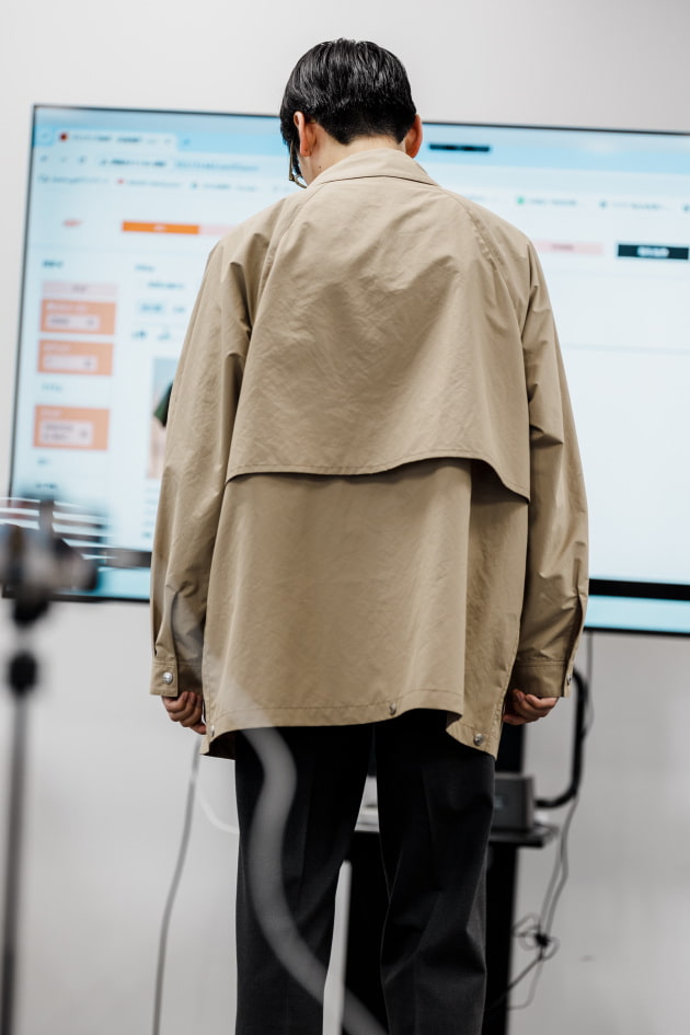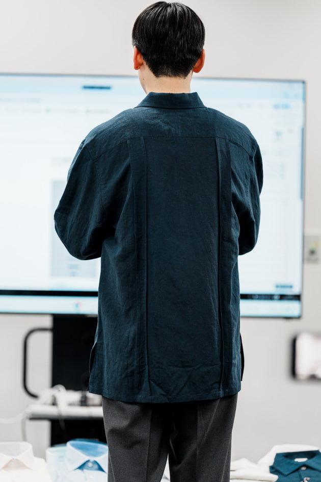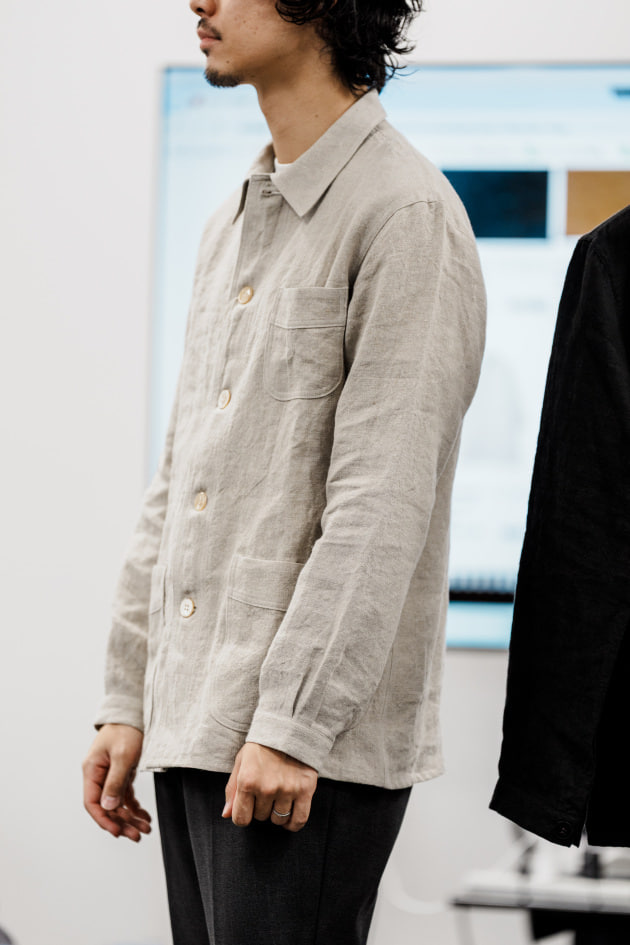 袖カフスですが、シャツジャケット、というにはドレスシャツ並みに小さかったので、今回ぐるりで3センチ大きくする修正を加えています。よりリラックスした雰囲気で来てほしいという意図が感じ取れますね。