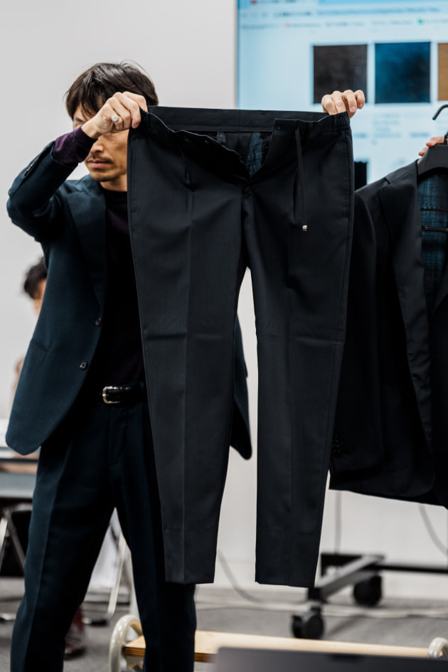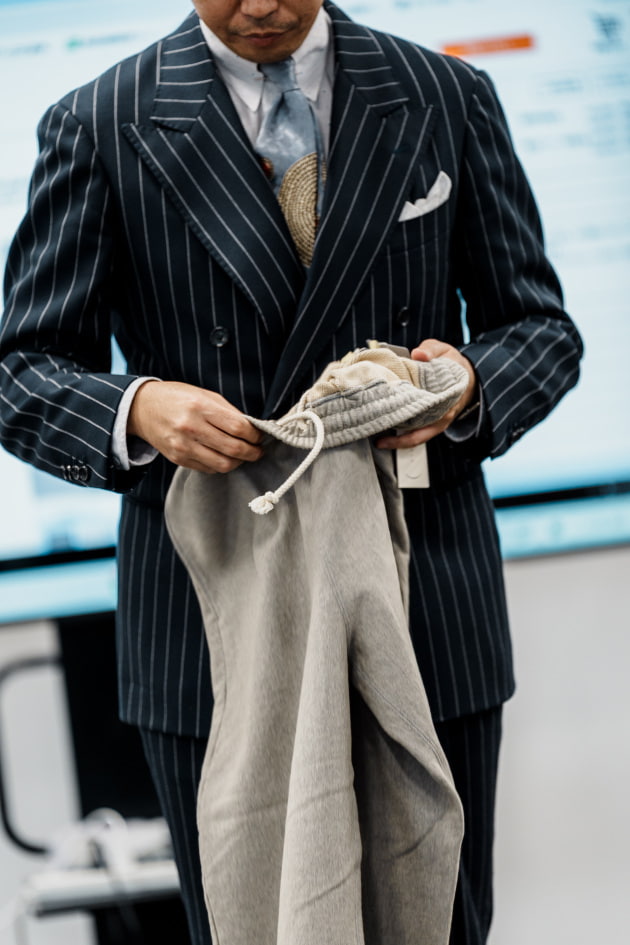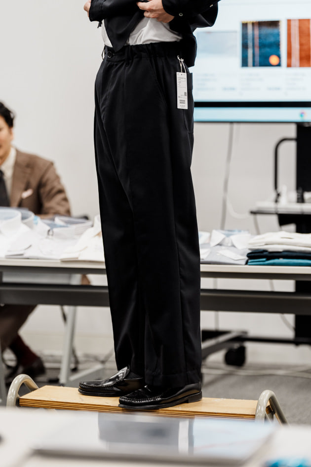 ラインナップ掲載はまだありませんが、セットアップ着用できるように組下のワイドイージーパンツも企画中です。