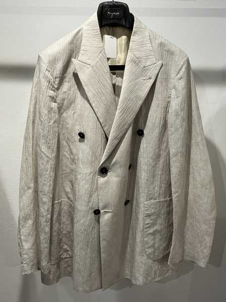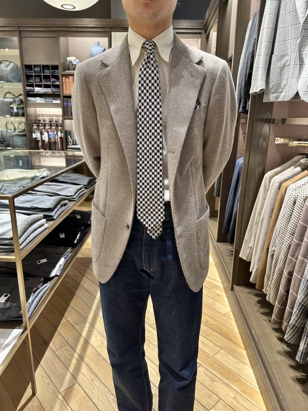 実物ないので定かではないですが、イタリア製のレーヨン70% リネン30%生地を使用とのことで、かなり軽快なジャケットになりそうですね。春夏のタッタソール、面白いかもしれません。