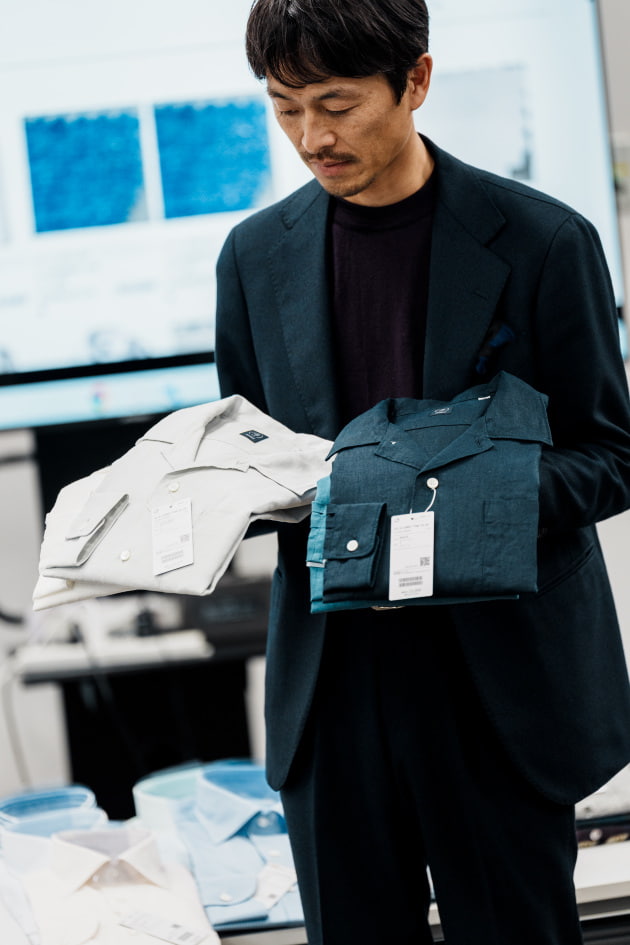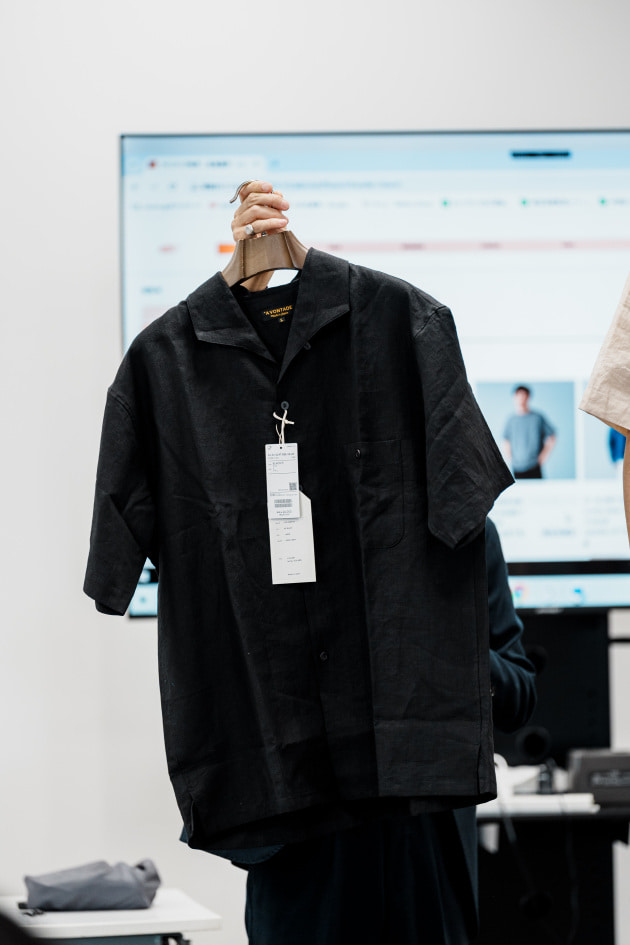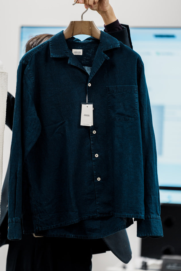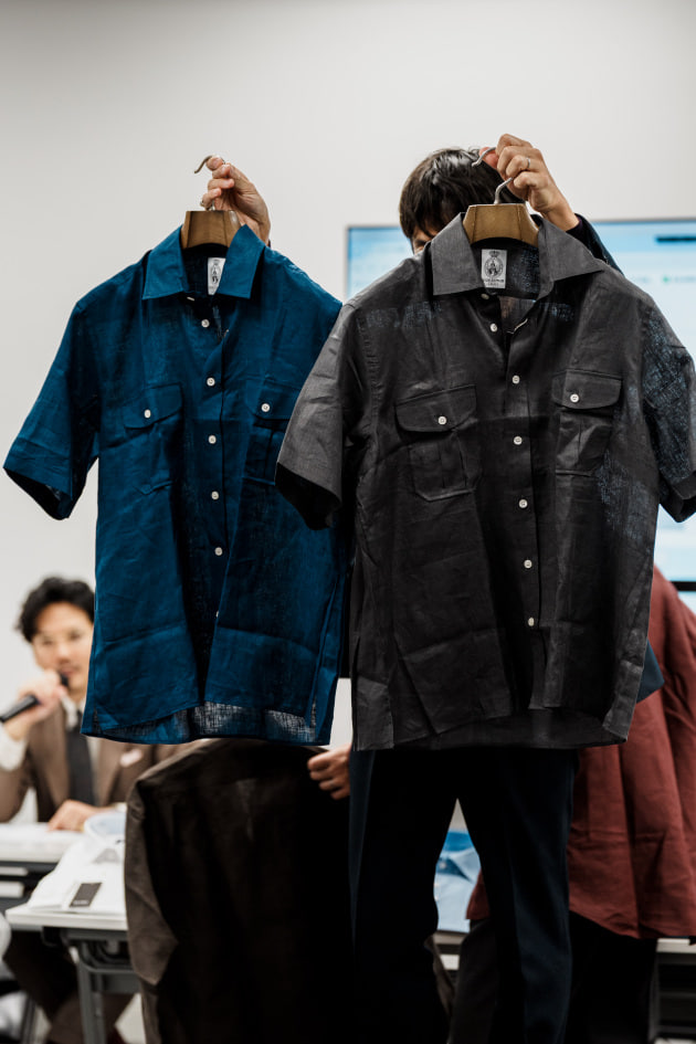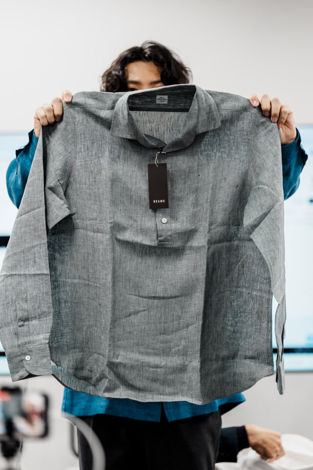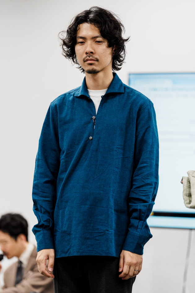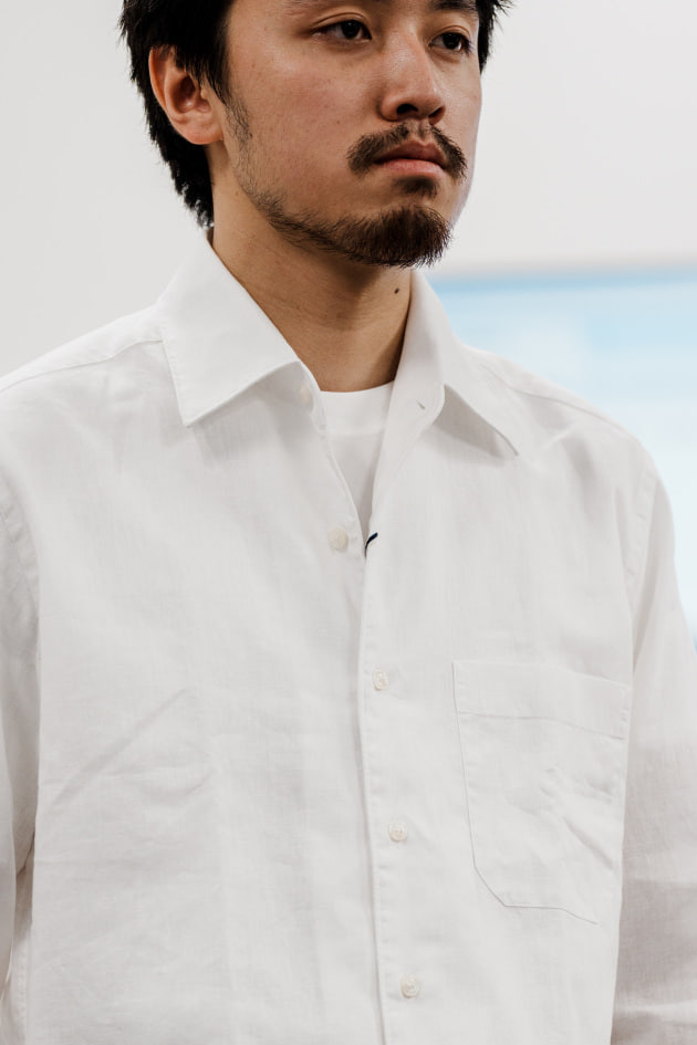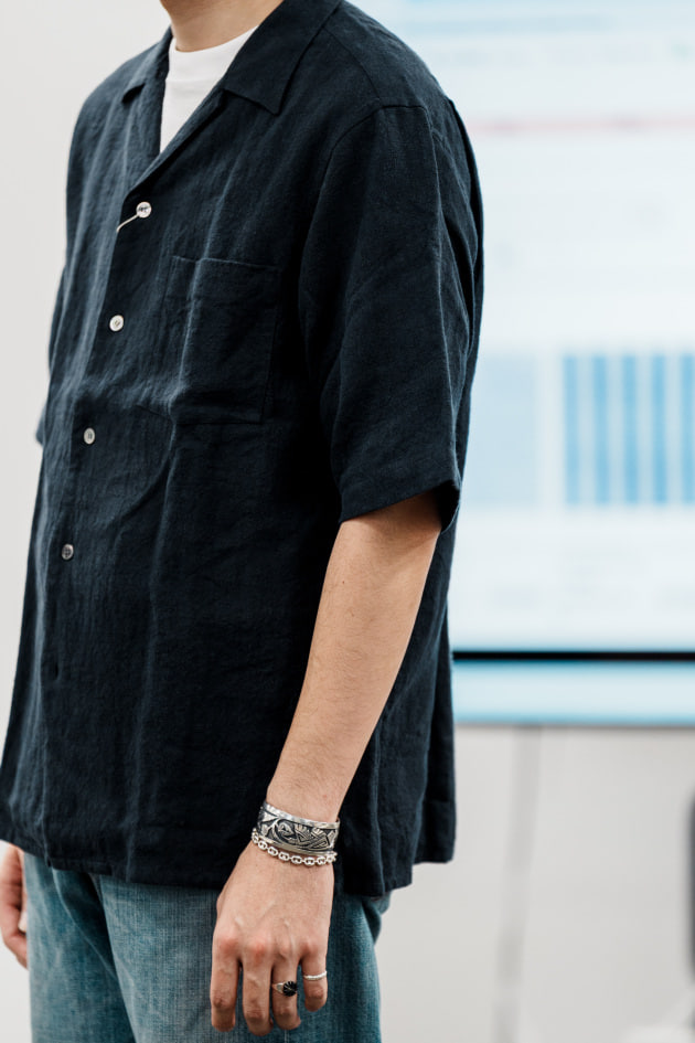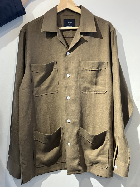 こちらは新型リネンレーヨンのオープンカラーシャツ。