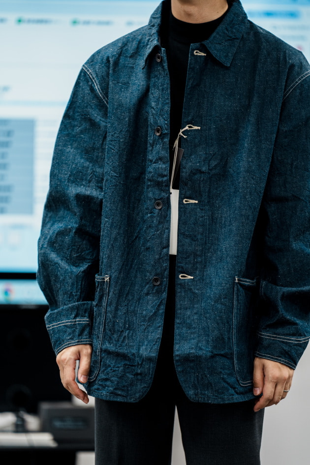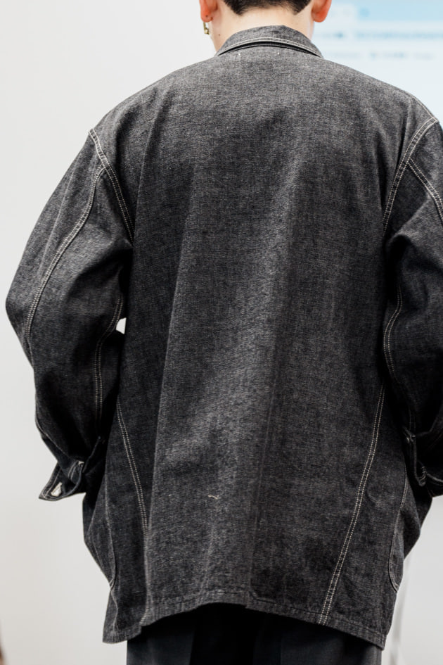 フレンチアーミーにあるような少し長いレギュラーカラーのような襟が特徴リラックスフィットでやや肩が落ちるバランス。