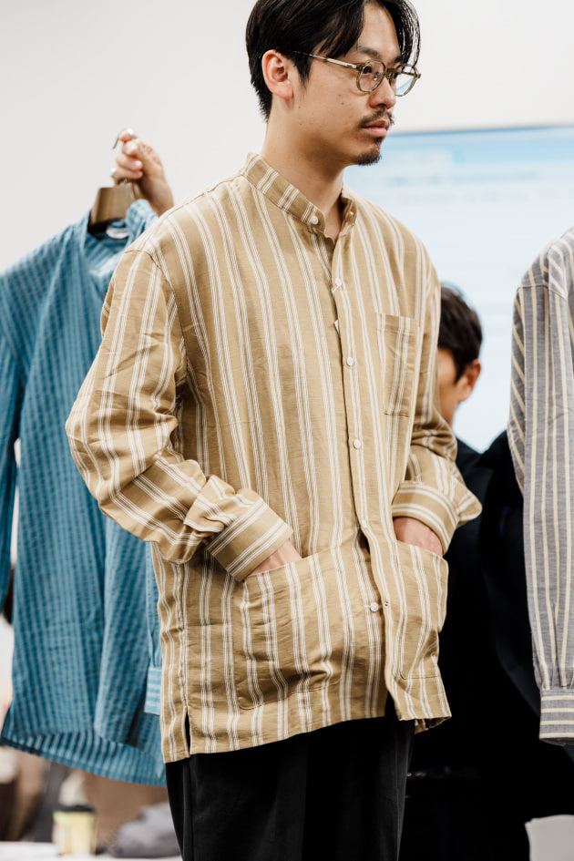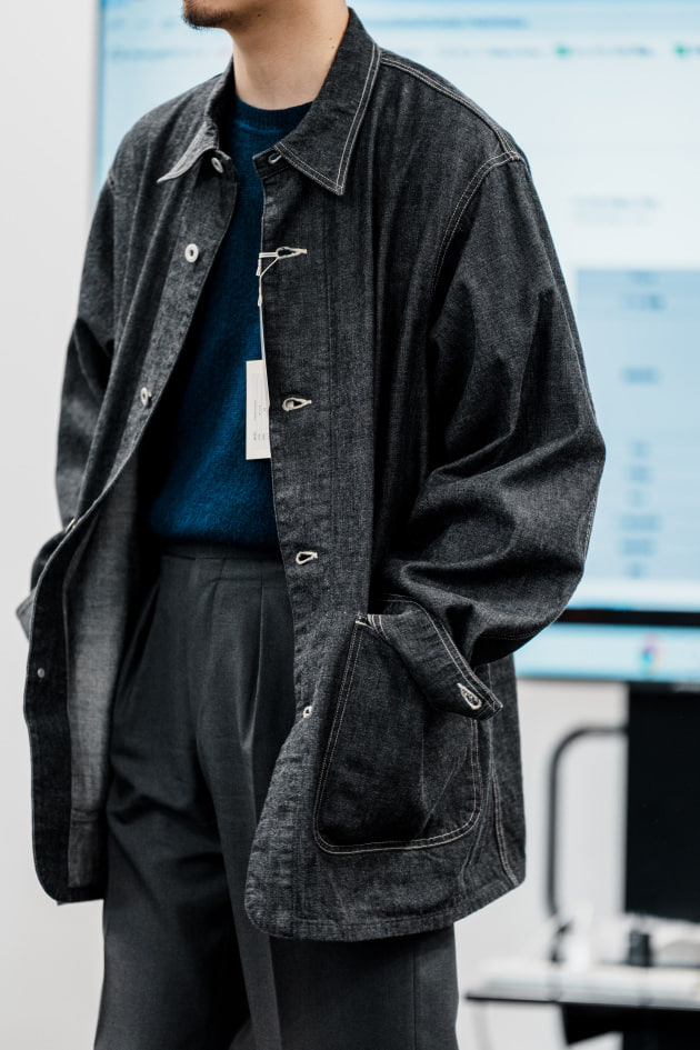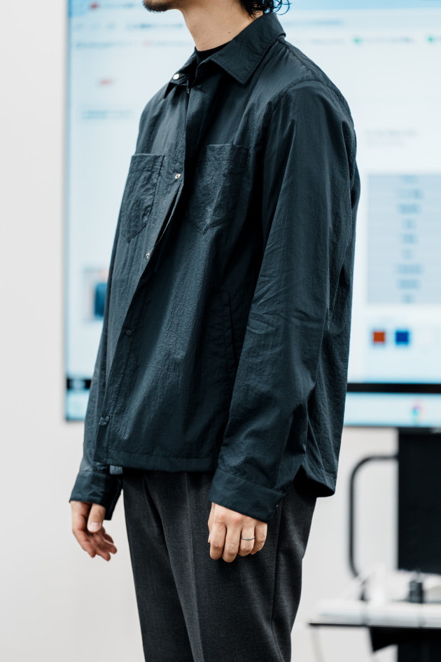 既存のバンドカラーシャツに腰ポケットをつけて、シャツジャケットにアレンジした別注品です。