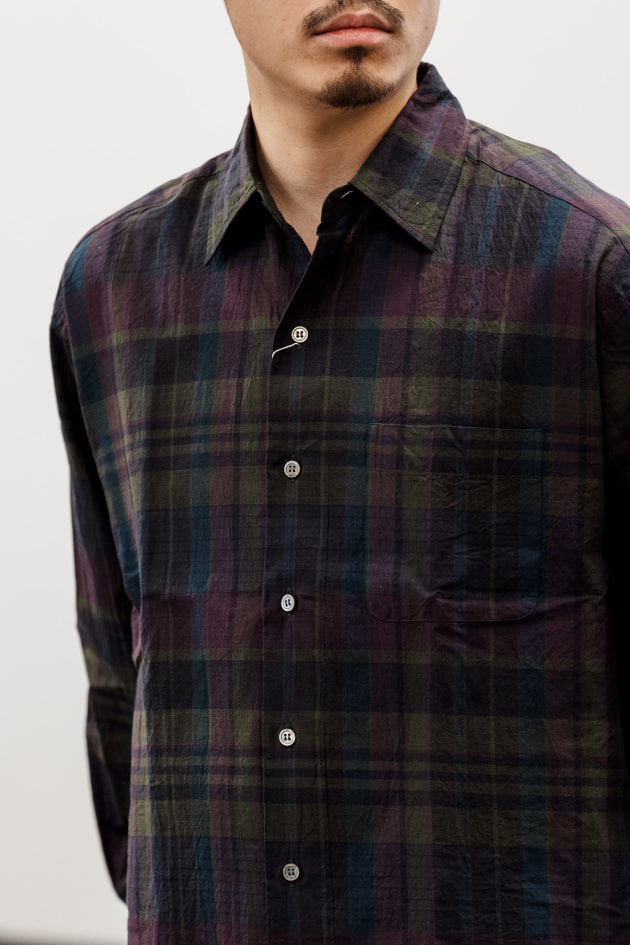 こちらはコットンリネンですね。<SIDOGRAS>の生地を使用しているため他の3型と比べて少し値が張りますが、ハウンドトゥースのビックシャツと言えば、昨シーズン大変人気で、店頭に並ばない商品がありましたね。