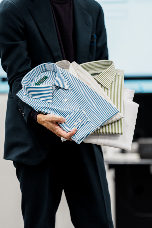 インポートのシャツと遜色ないようなカラーシャツや、変わったストライプをご用意。ネイビーやチャコールグレーなどのダークスーツと相性の良いものをピックアップしています。