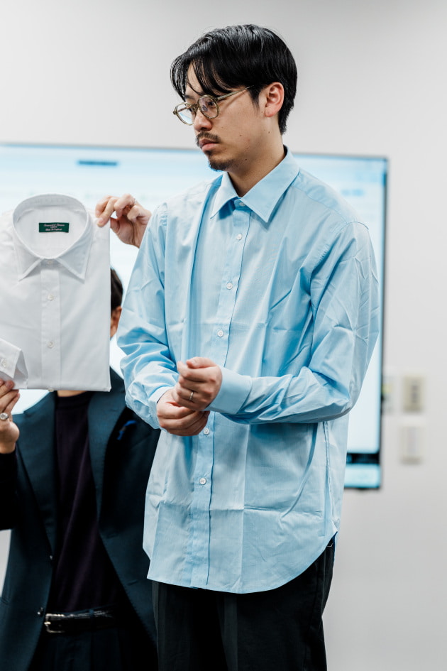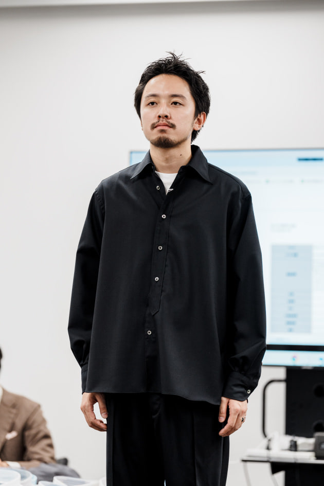 よりマイルドな印象に見えるよう、ボタン位置を全部指定して、襟もカッタウェイからワイドに。