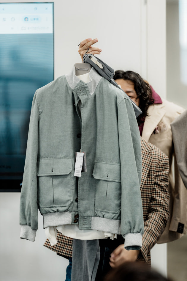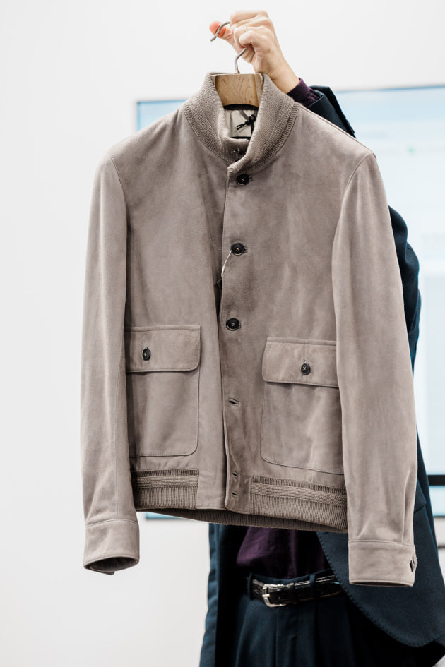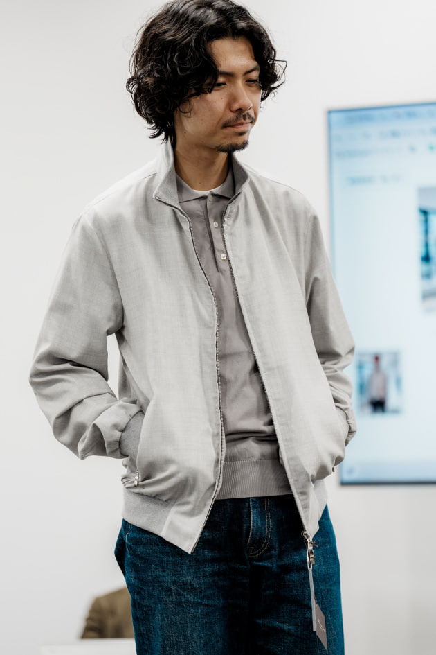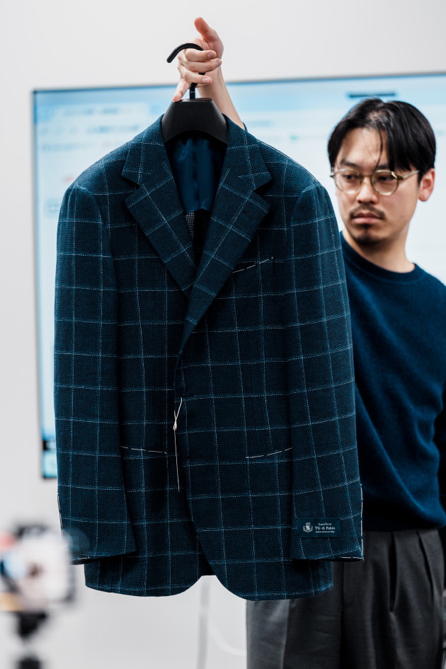 こちらは<TRABALDO TOGNA>は目付350gのウールリネン生地。縦糸にウール55%、リネン45%の混紡糸混紡糸を使用し清涼感を出し、横糸に双糸のsuper120原料のエストラートを使用することでストレッチ性を持たせています。明るいブルーが印象的なジャケットですね。