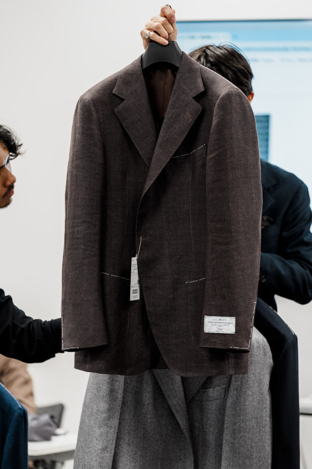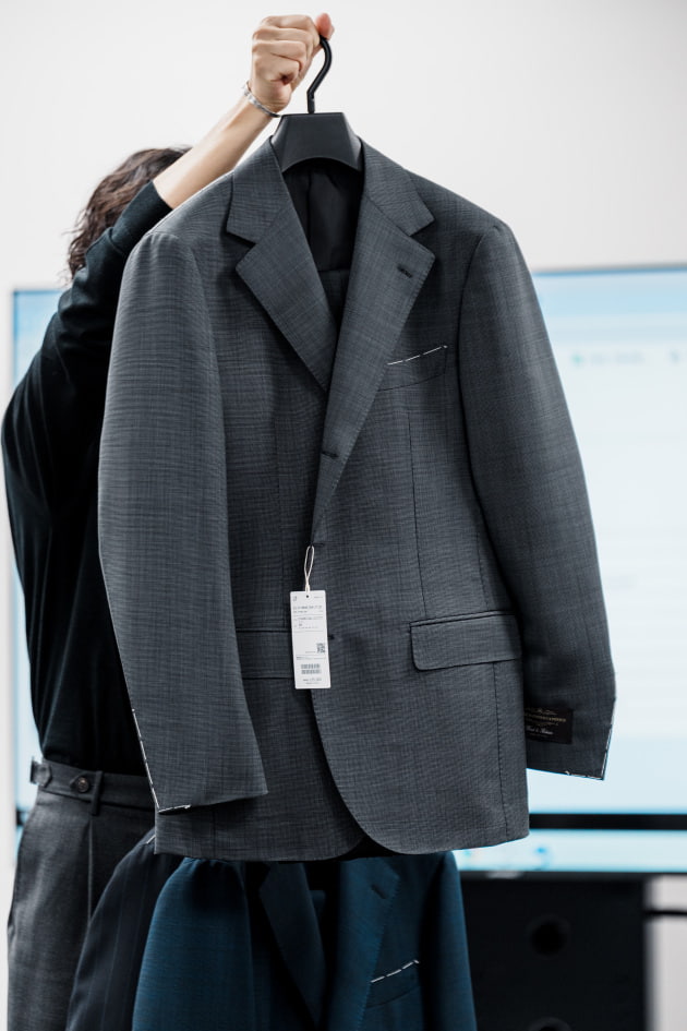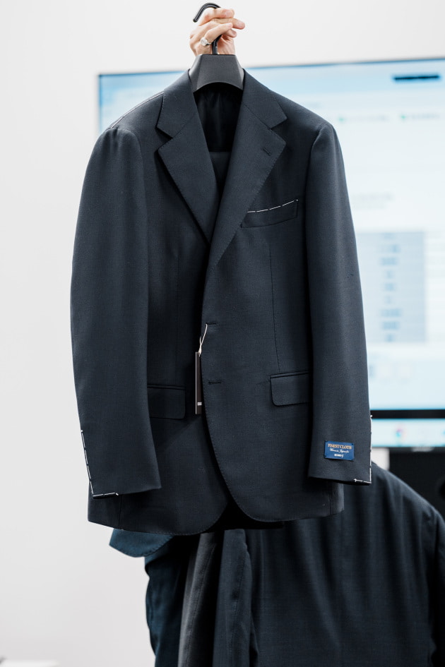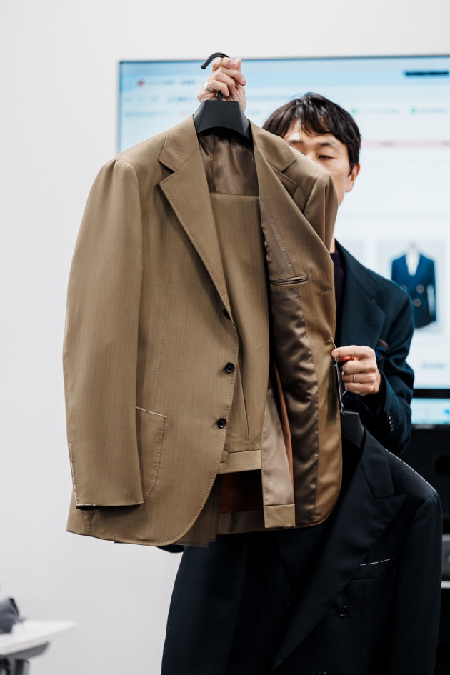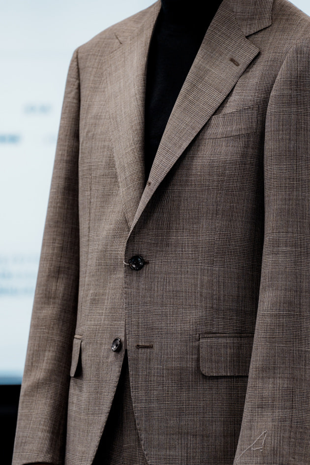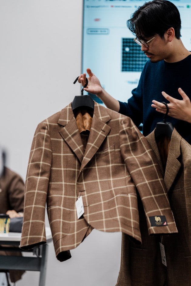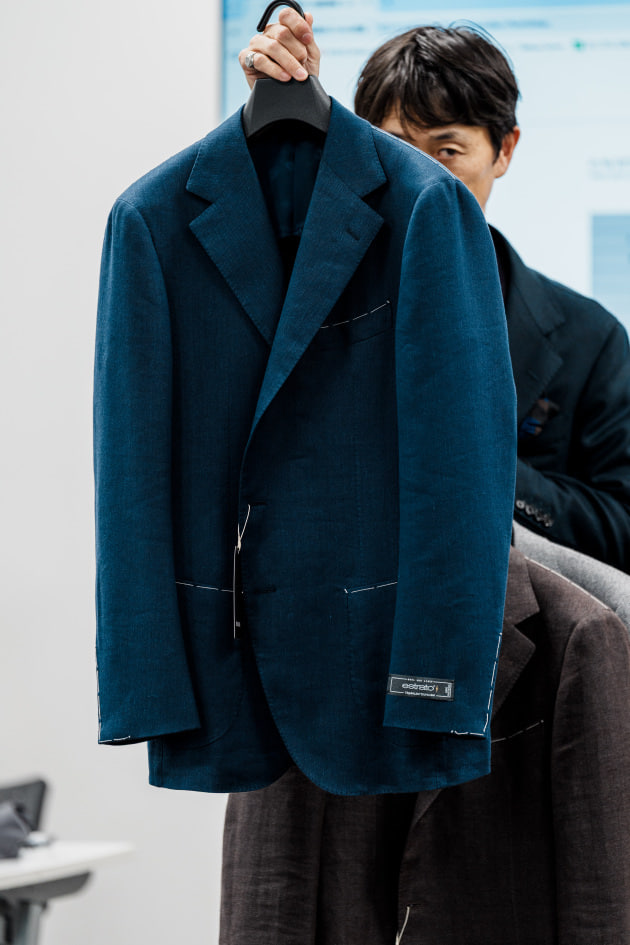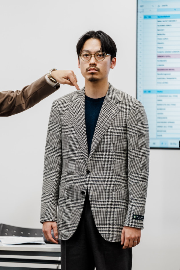 今までは肩周りは柔らかい芯を入れていたので、パターンオーダーなら問題ないが、肩幅が合わない方だと落ちてしまい、窪んでしまったり、シワが入りやすかったところ、イタリアでも多く採用されている1枚の本バス芯に変更することで支えになり、綺麗にハマる許容値を広げた、と言ったところでしょうか。