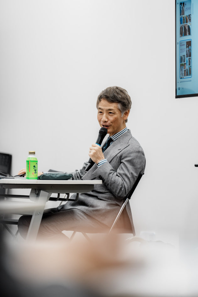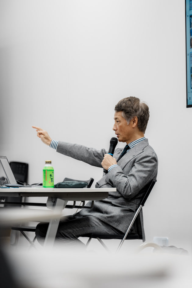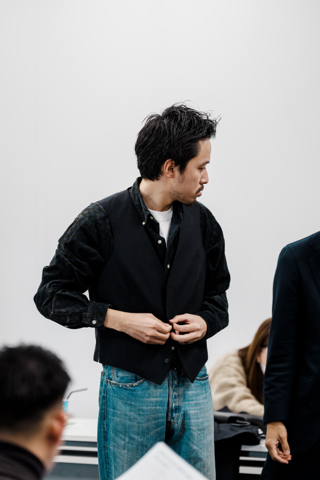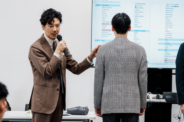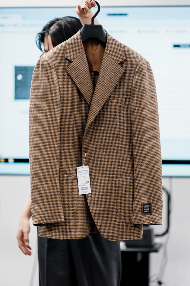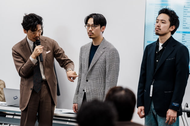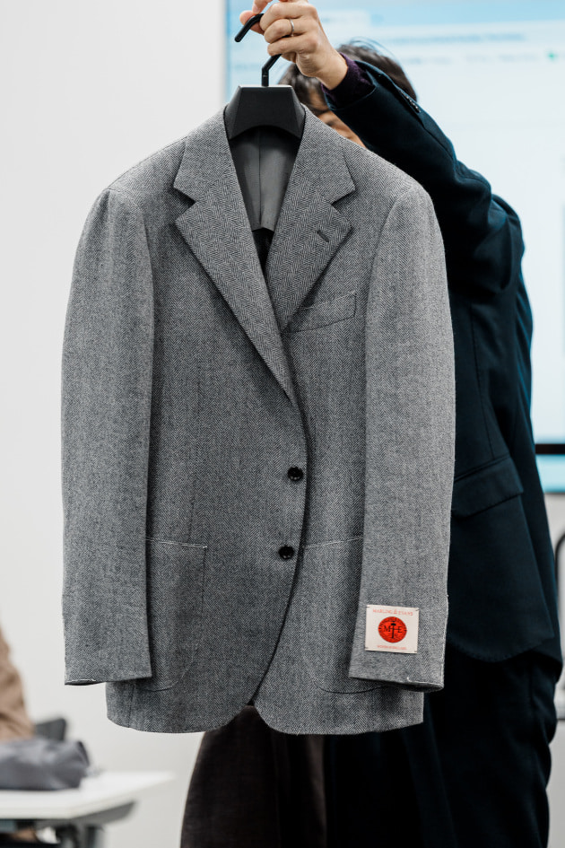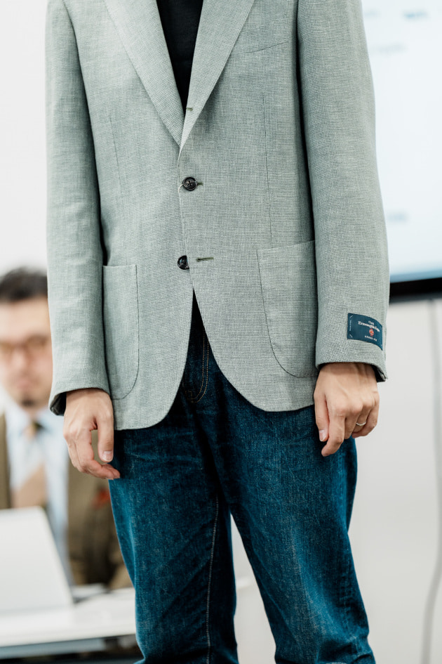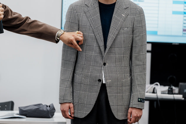 今までは肩周りは柔らかい芯を入れていたので、パターンオーダーなら問題ないが、肩幅が合わない方だと落ちてしまい、窪んでしまったり、シワが入りやすかったところ、イタリアでも多く採用されている1枚の本バス芯に変更することで支えになり、綺麗にハマる許容値を広げた、と言ったところでしょうか。