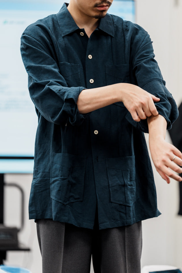 肩線が構築的に見える分は肩先の処理に一手間かけ、袖に丸みを持たせることでナチュラル感は維持。