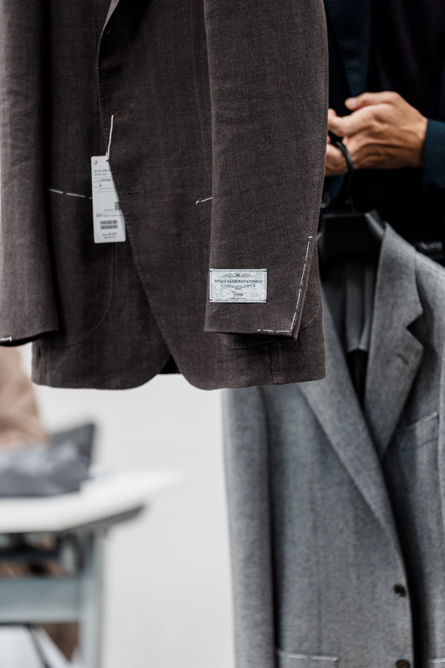 <Vitale Barberis Canonico>はリネン66%、ウール34%の、よくみるとヘリンボーン織りの生地。