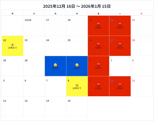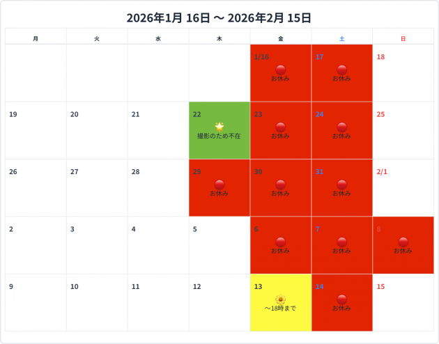 月毎にこういう出勤スケジュールも作成しておりますのでご来店、お問い合わせの際にお役立てください。
