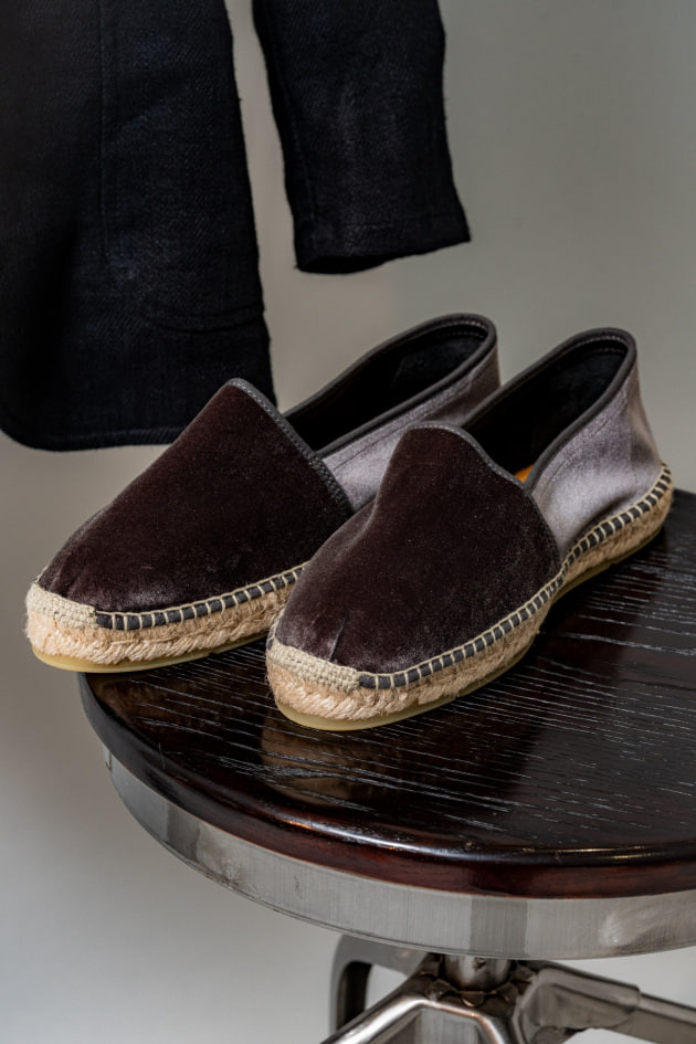 こちらはそんなに弱くないからご安心くださいと西口は言ってましたが、春夏仕様の薄手の生地を、ジュートソールと直接縫い合わせているのだから、弱くはなかったとしても強くはないです。負荷がかかりすぎると生地破けるのは当たり前なので、間違えても革靴と同じようにビタビタのサイズで購入しないようにご注意ください。あと単純にベルベット生地が固く感じたので以前購入したことのある<Don Quichosse(ドン キーショス)>のものと比べてワンサイズはあげる必要がありました。サイズ選びの参考までに。