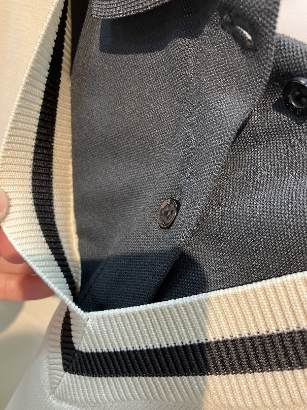ポロシャツとVネックのニットを重ね着しているようなデザイン。