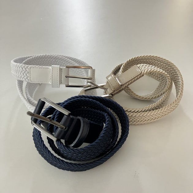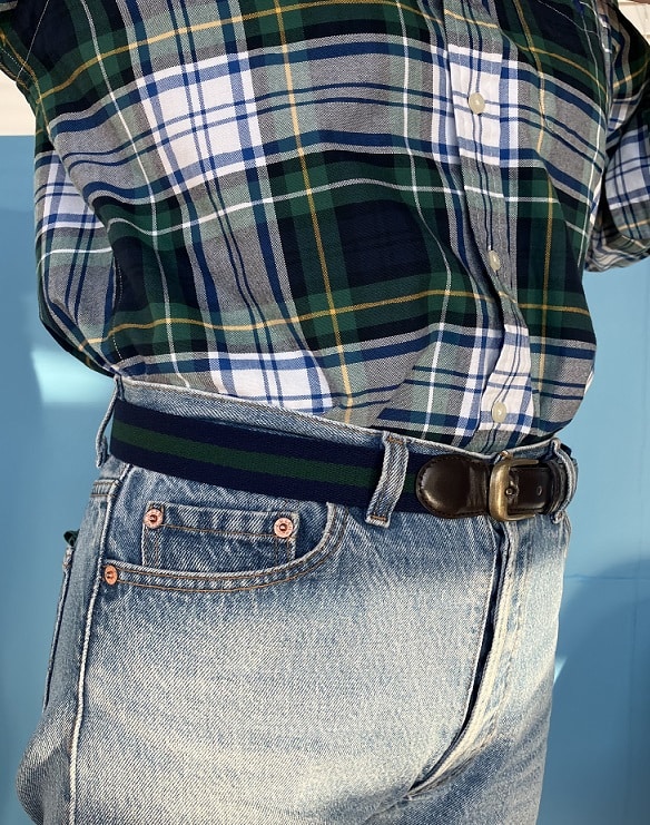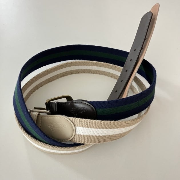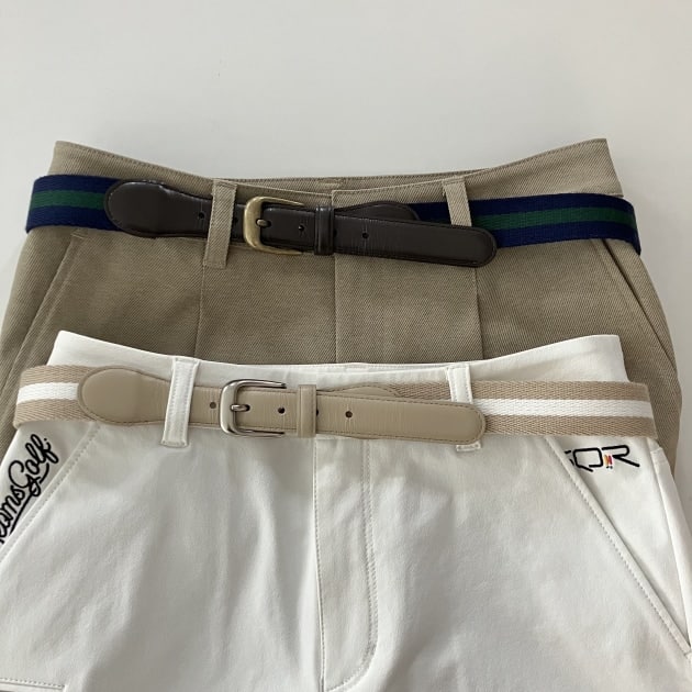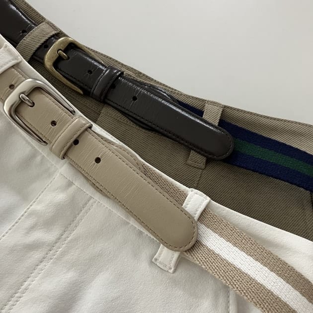 トラッドなスタイルにぴったりの配色ラインテープを使用したベルト。