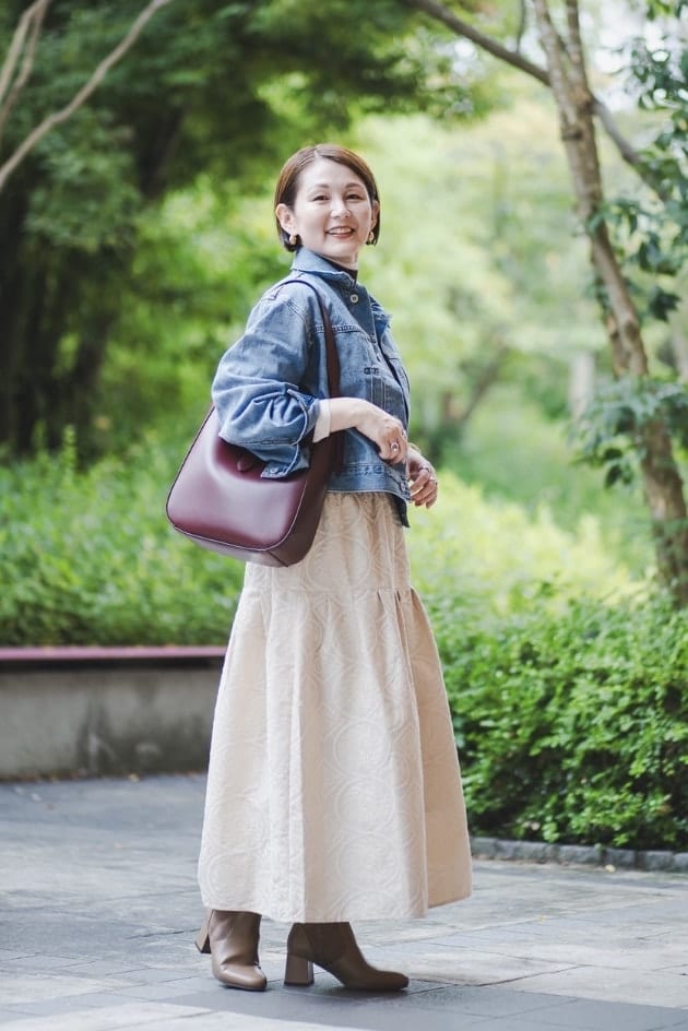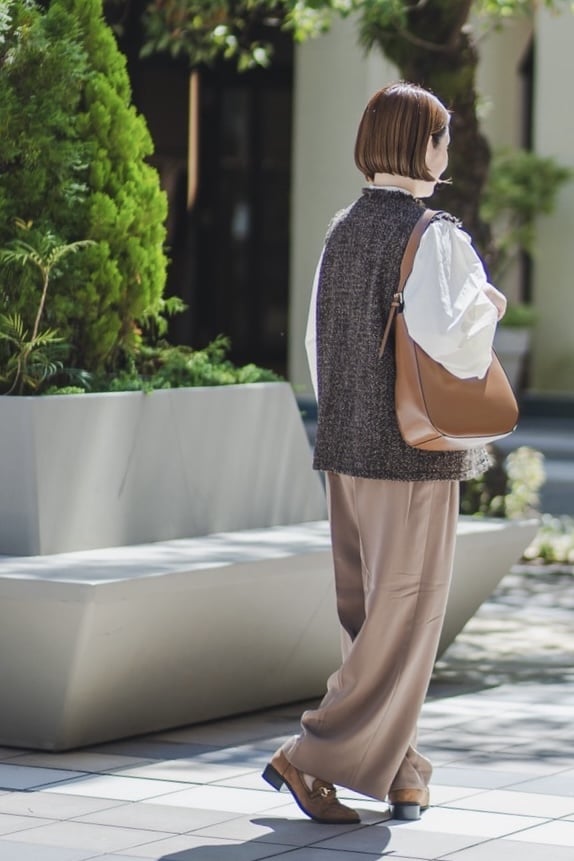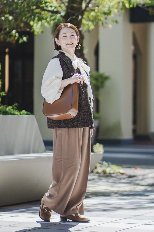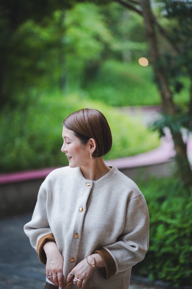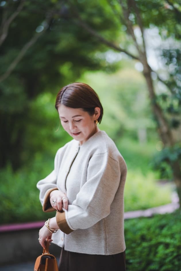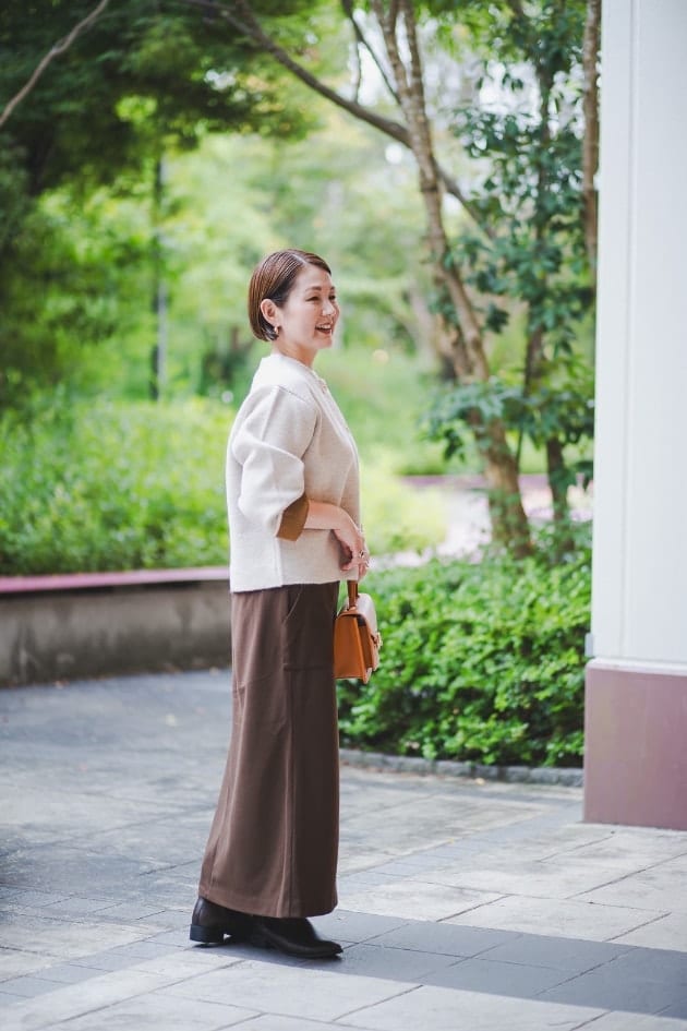 ラメニットのさりげない華やかさが、秋の日差しに映える大人の上品さを引き立ててくれます。