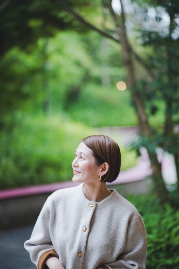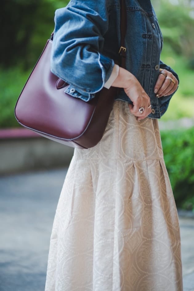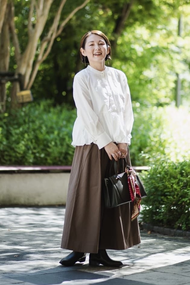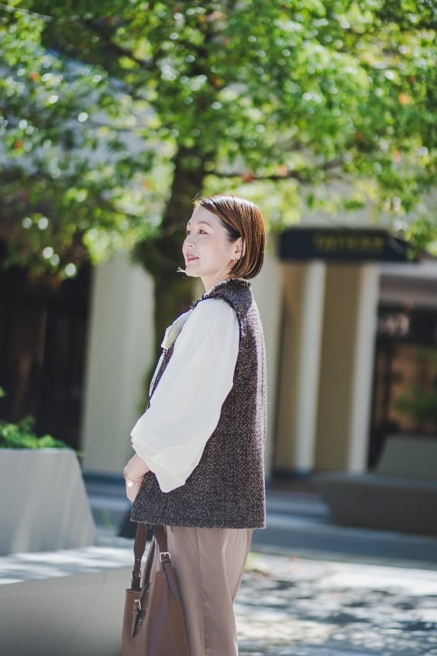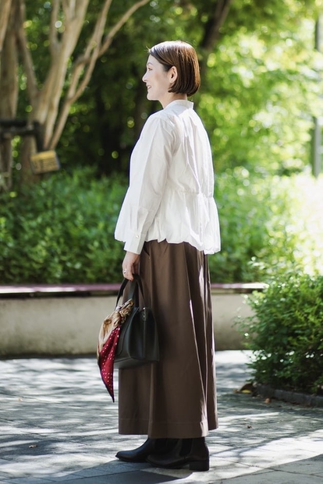 ラメニットのさりげない華やかさが、秋の日差しに映える大人の上品さを引き立ててくれます。