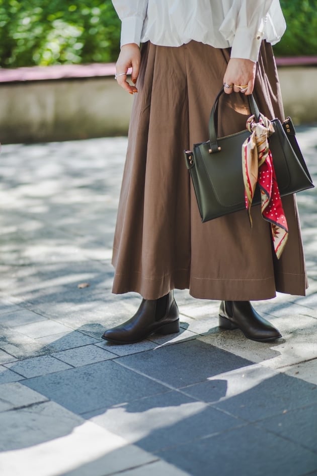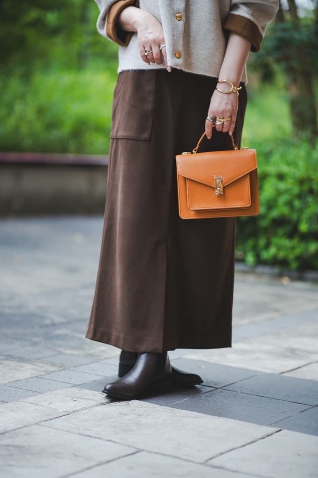 マットな質感のモッズコートに、ウールライクのプリーツスカートを合わせたキレイめカジュアル。