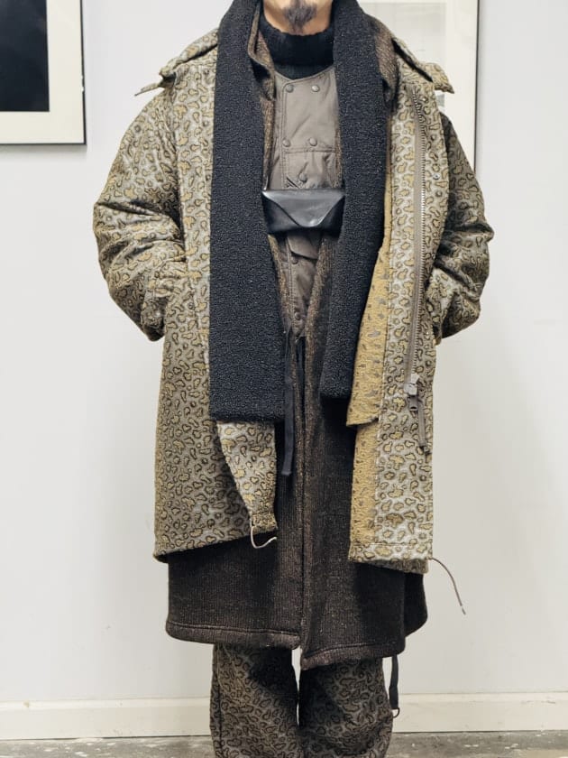 コートのライナー使いとしてENGINNERED GARMENTSのニットローブを重ね着。