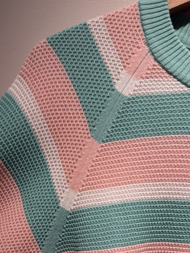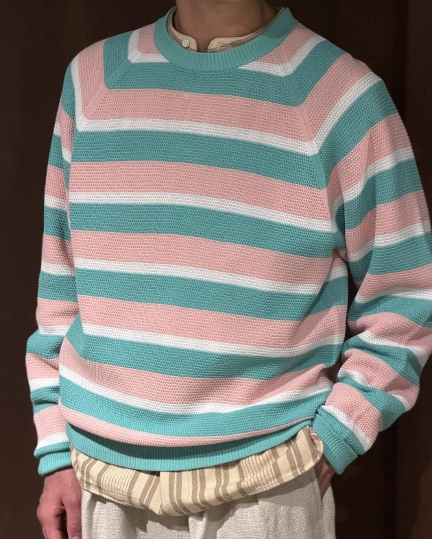 帰りのフライトも同じ格好になれるように防臭効果のあるハイゲージのウールニットに