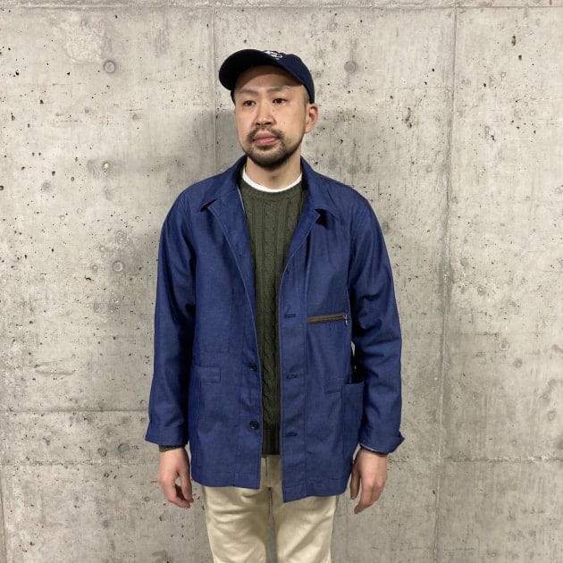 オリーブのケーブルニットにネイビーブレザーと王道な組み合わせにしようかと考えましたが、ここはワークジャケット。